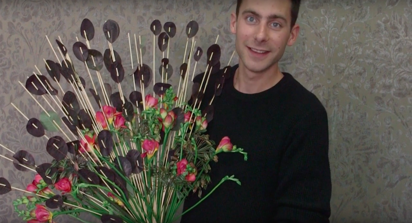 Sören van Laer showed his idea with fragrant Freesia during Fleuramour 2019. He created a quick fan-shaped frame in between which he weaves pink Freesia. He decorates the frame with leaves. Quick and original!