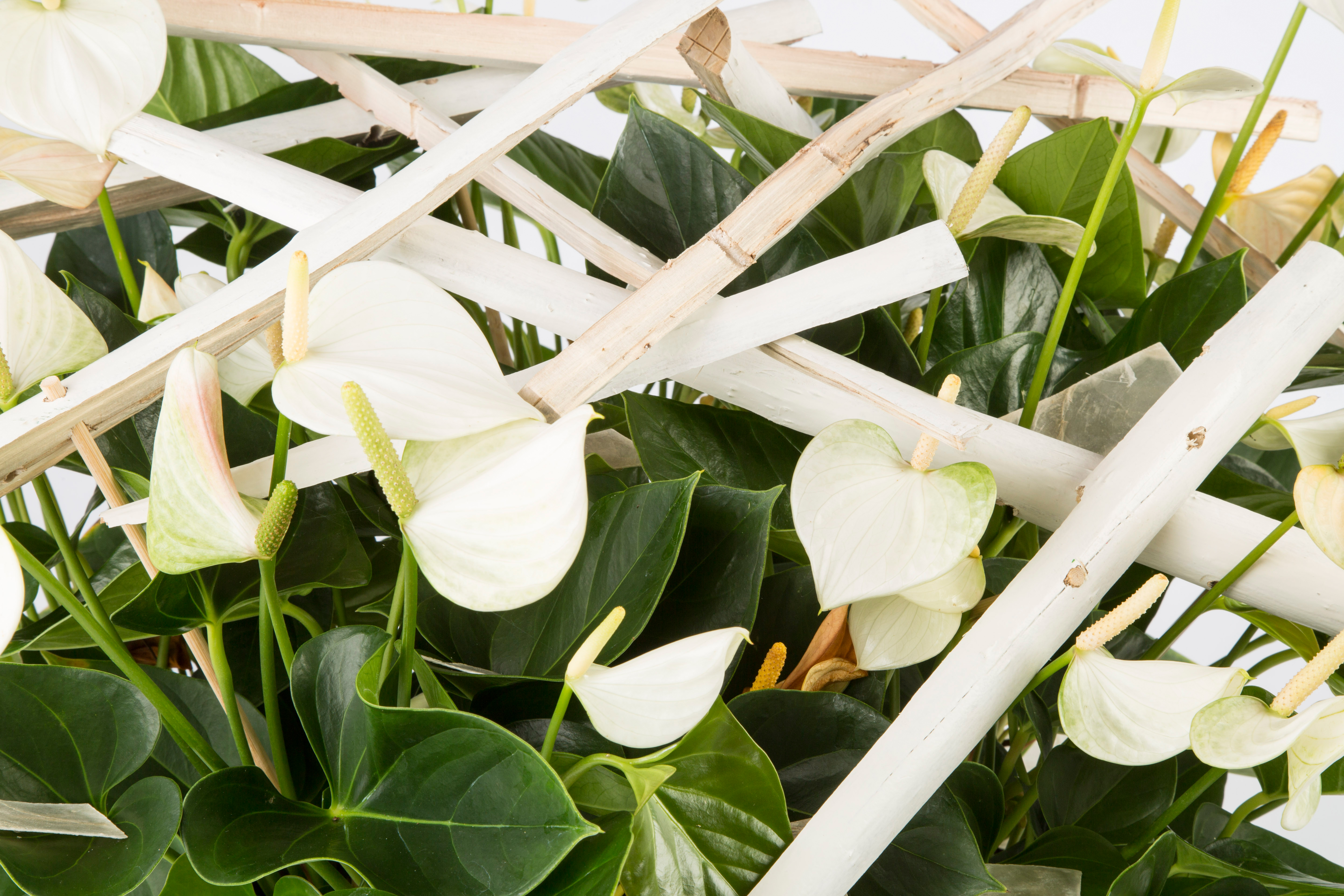 Beautiful Adios® White Anthuriums don't need much, but adding some detail is always a good idea.