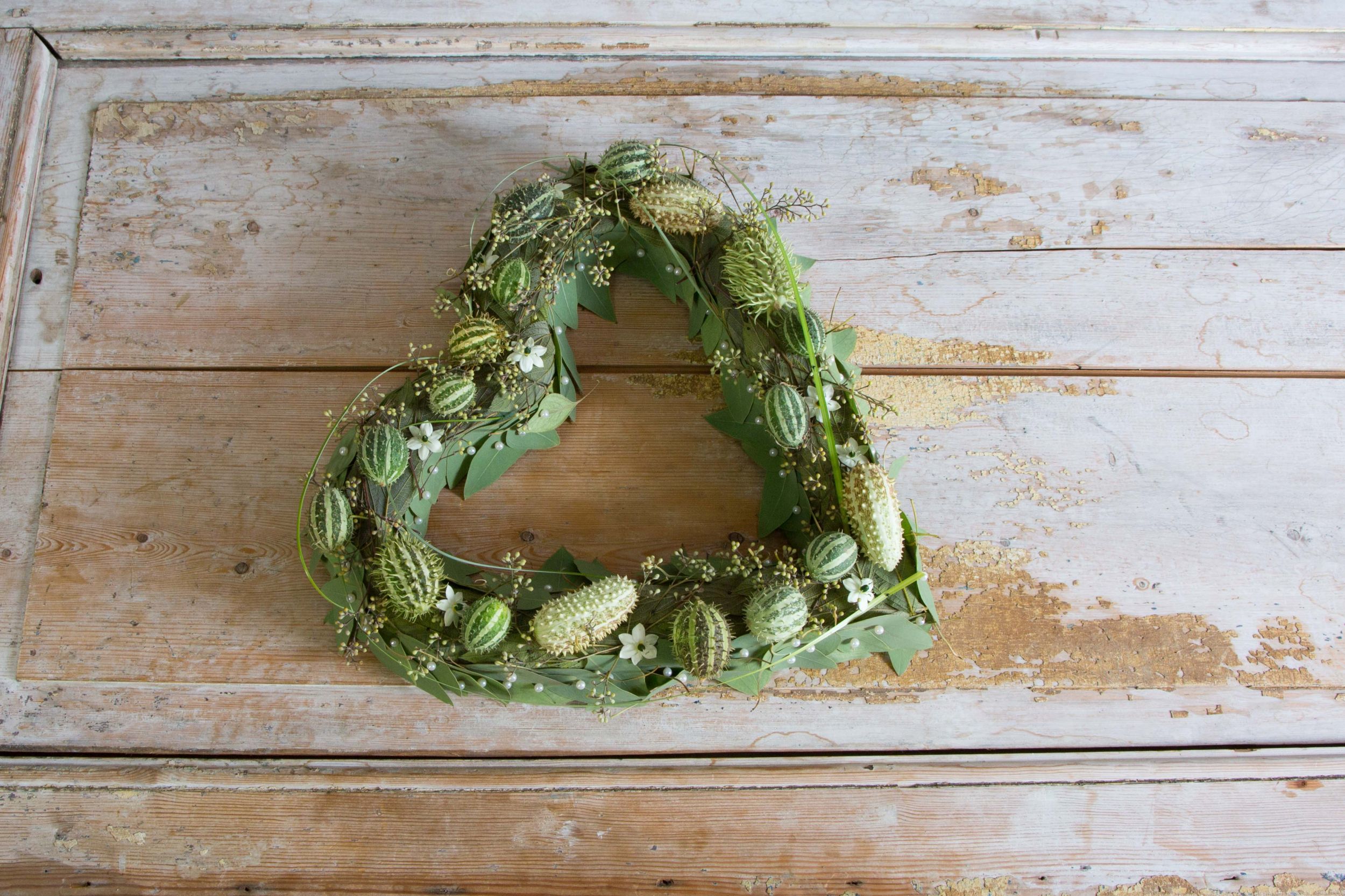 Roos van Unen has created a green funeral arrangement with an open heart base of Oasis floral foam. Around the heart, Eucalyptus leaves are pinned and on top of it a selection of decorative fruits play the leading role. It is not always necessary to use flowers to create a delicate impact.