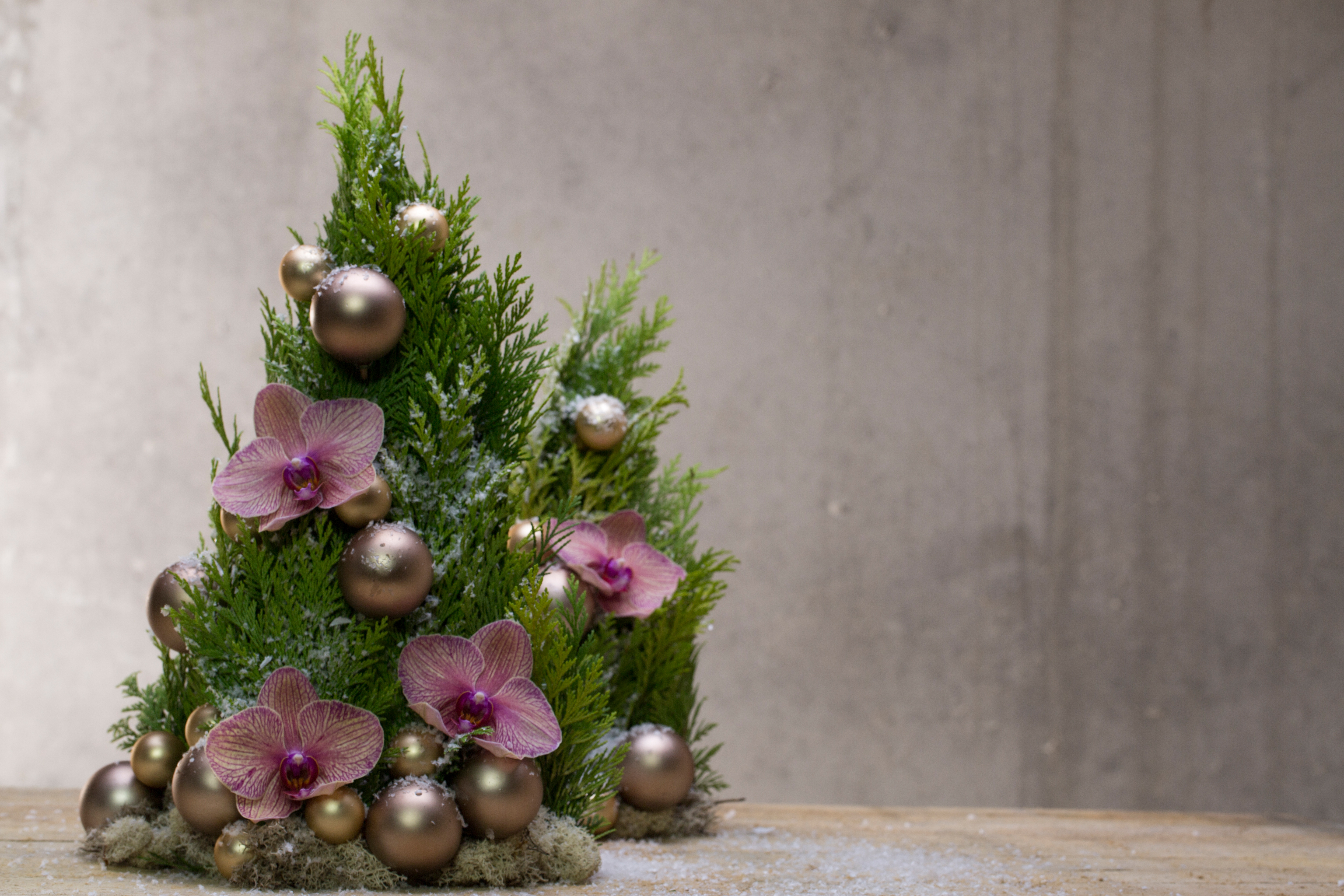 If you don't fancy a big Christmas tree in your house, but you do love the smell of Christmas greens, this might be the design idea for you! Nelleke Bontje created a tree shape with different greens and flowered it with just a few beautiful 'Baldans Kaleidoscope' Phalaenopsis orchids.