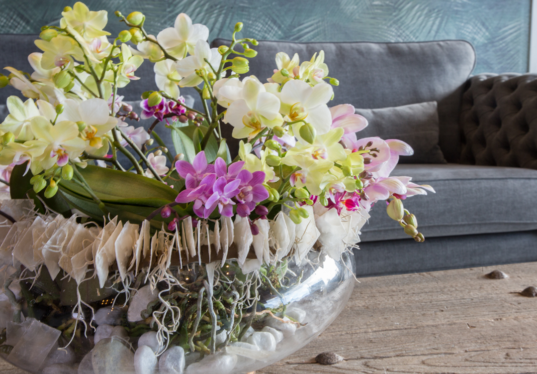 This beautiful plant arrangement with Phalaenopsis orchids looks stunning in a country chic interior. One single plant is beautiful as it is but there's strenght in numbers! Placed together in a decorative bowl, it adds up to a rich design. Nelleke Bontje shows you how to make this exiting eye-catching arrangement in this video tutorial.