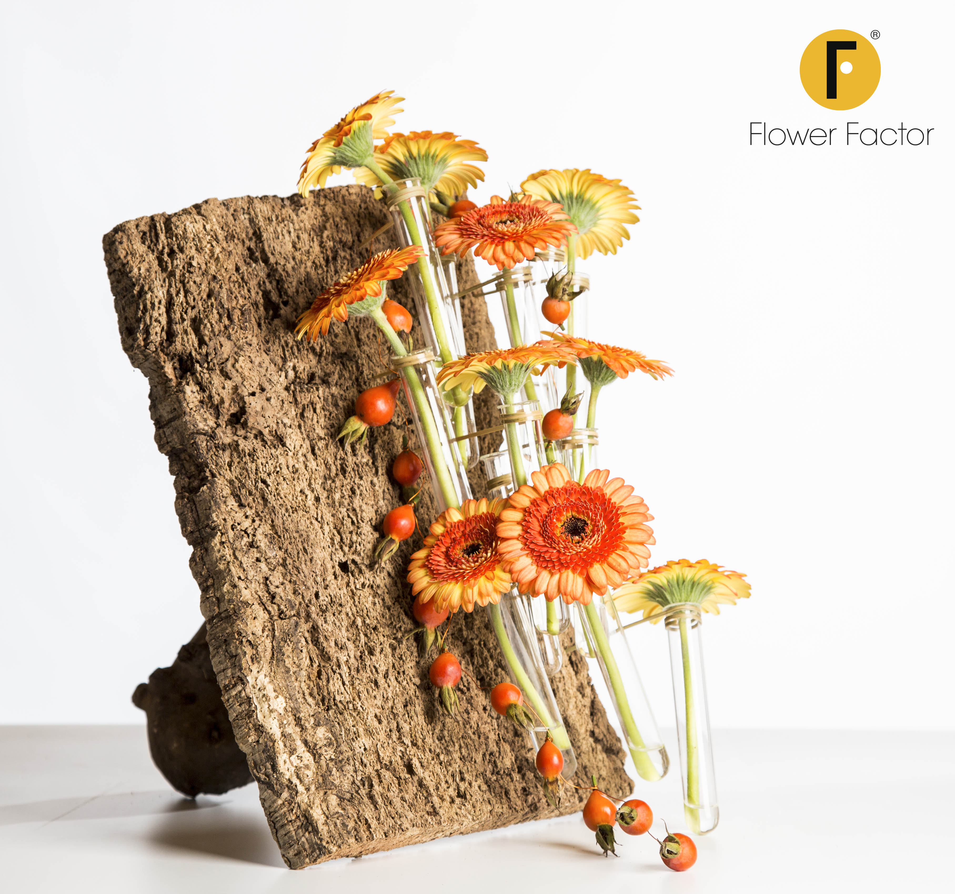 Flower Factor autumn inspiration: a design with bark and Gerbera