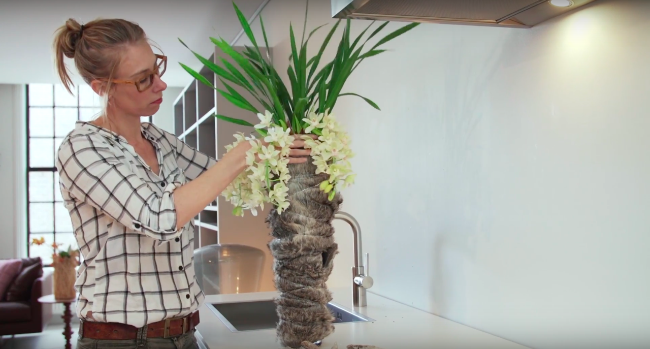 Even a natural beauty loves to dress up! Like this Cascade Cymbidium, a stunning orchid with a 'cascade' of flowers! She gets a nice and warm planter to show off in, designed by Nelleke Bontje. She used fake fur and a string of wooden pieces to create an interesting arrangement. Easy does it and within minutes you'll have a show stopping plant arrangement that will lighten up any living room!