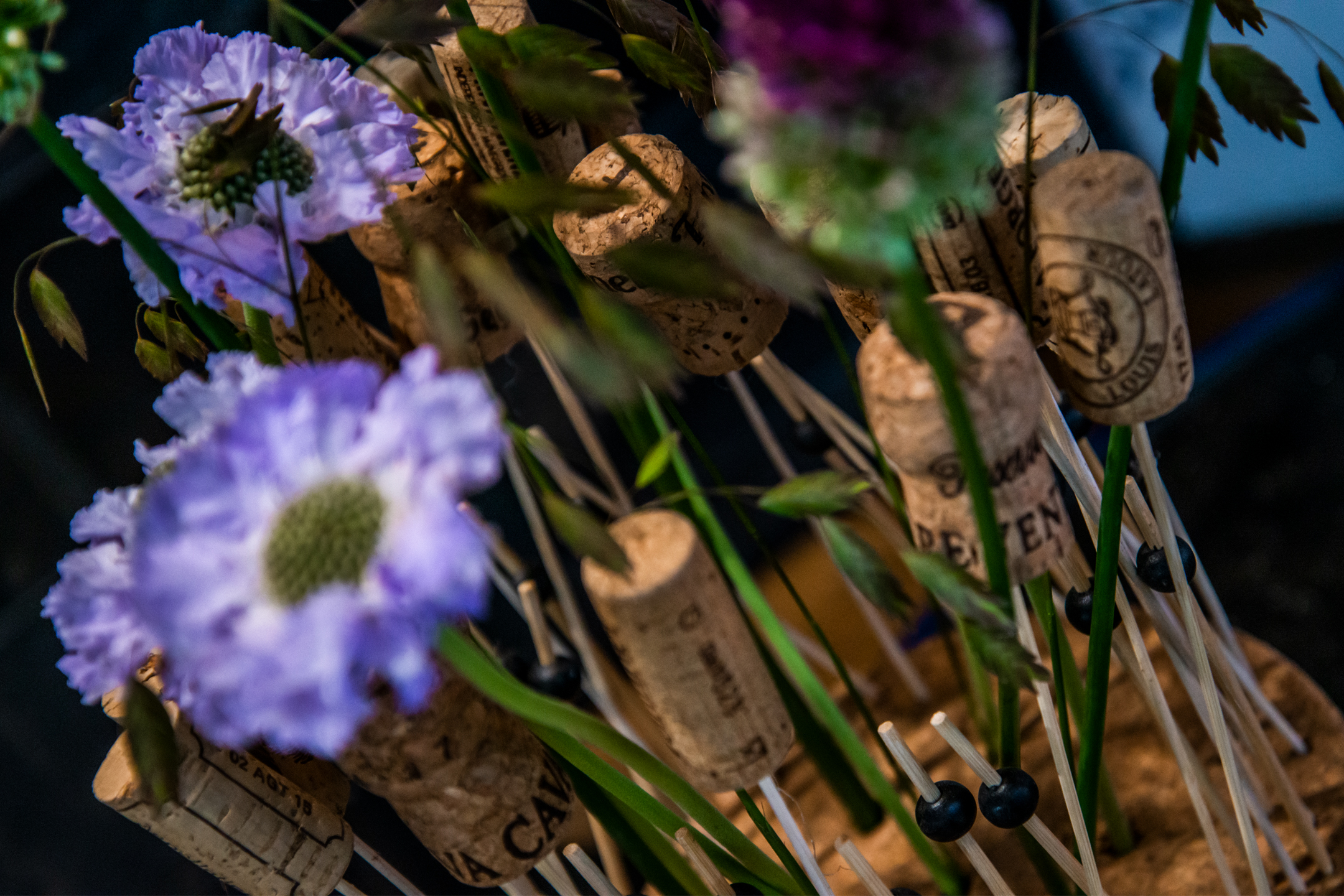 What better base to suite a flower arrangement for a restaurant than corks? This wild and lovely flower arrangement by Kristel van Dijk is a real eyecatcher! She used Scabiosa, Chasmantium and Alium in colours that matches the restaurant.