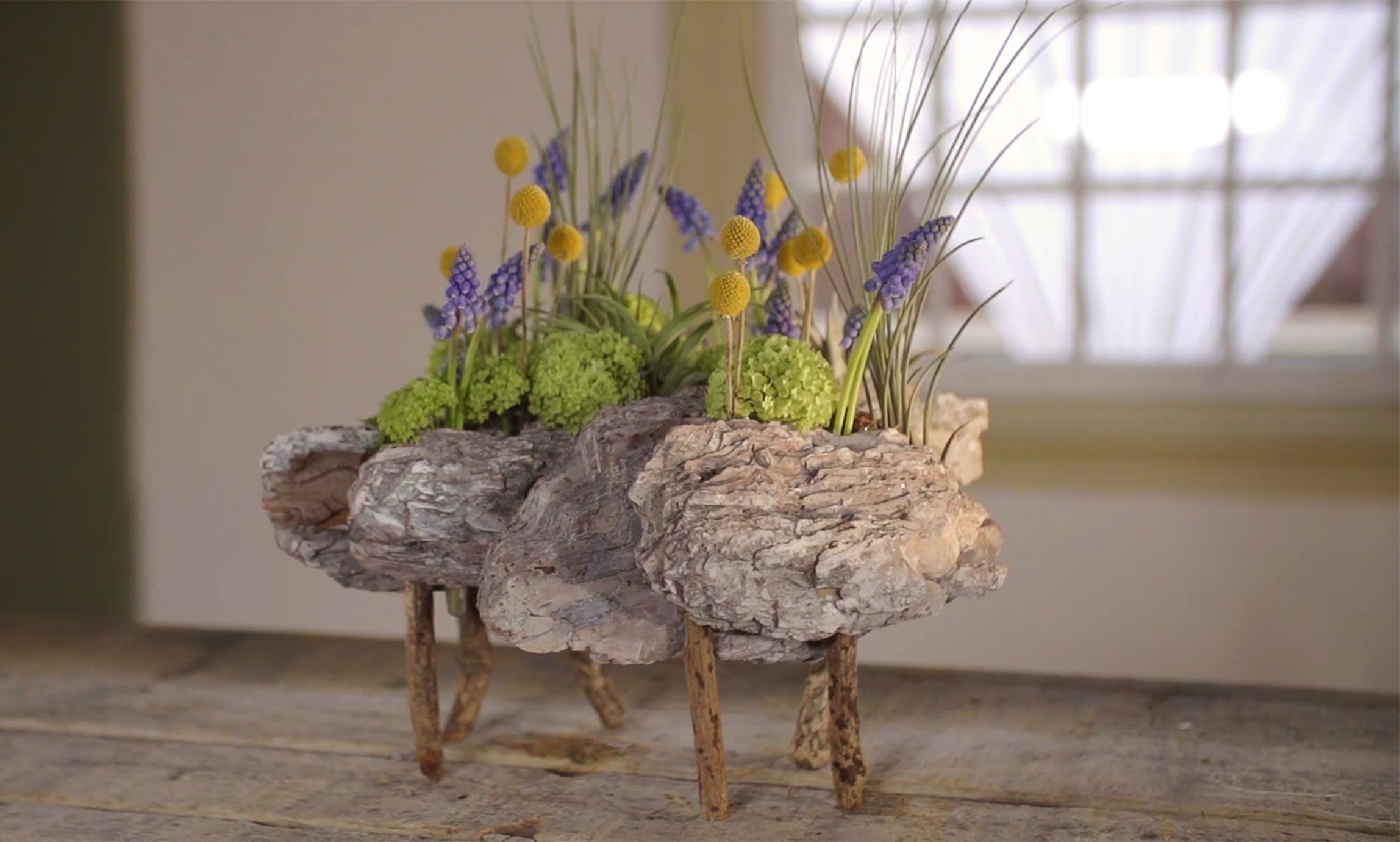 Lovely spring design by David Ragg. He creates a base by glueing bark together with plastic tubes and sticks and uses fragile Muscari and Snowball to complement this design.
