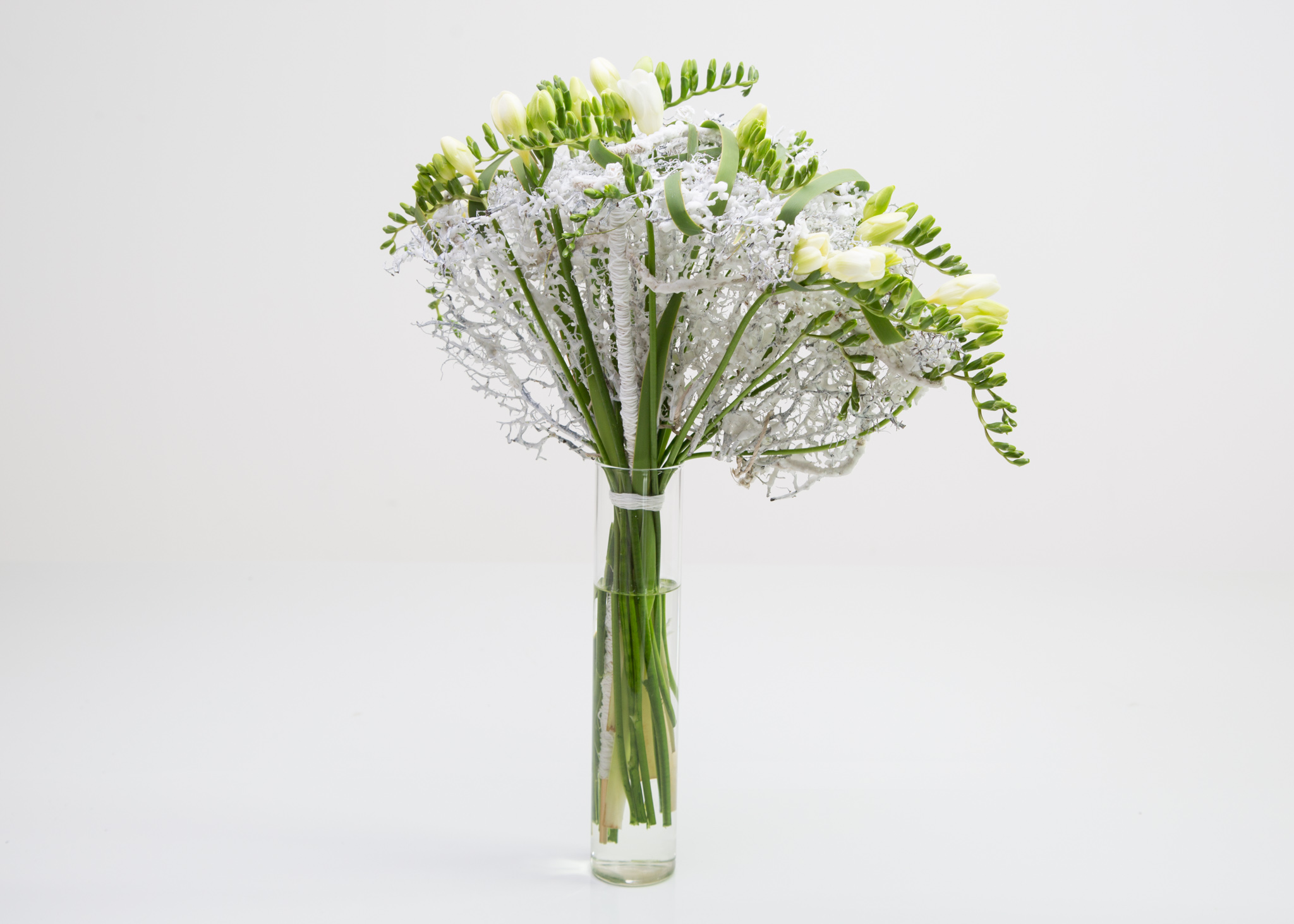 Roos van Unen made this beautiful bouquet with all white Freesia and some green details. A structured piece of dried wood is given a stem to hold by covering a stick in white wool and connecting that to the dried wood. The flowers are inserted in the bouquet in the way that it keeps the beautiful fan shape. The Typha leaves are curled and waved in between and help keeping the Freesia in place.