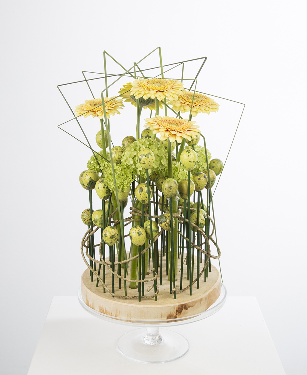 With soft yellow gerberas and fresh green viburnum, Pim van den Akker created another beautiful Easter design.