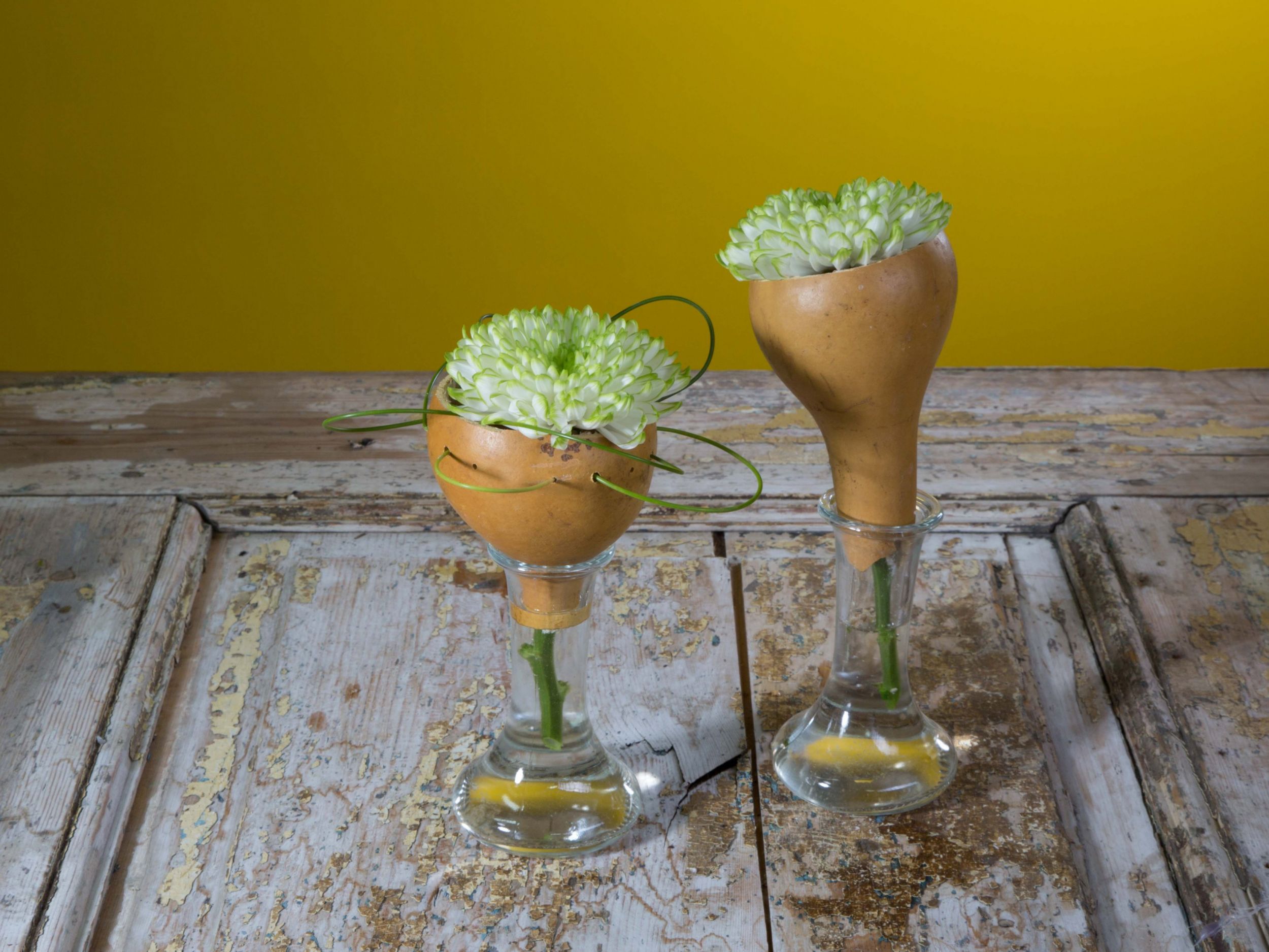 Simple autumn design: cut the top and bottom from a dried gourd, pierce holes on the edge, weave through some grasses and place in/on a vase. Put in just one flower like this beautiful 'Zembla Lime' Chrysanthemum and you have a cool little arrangement.