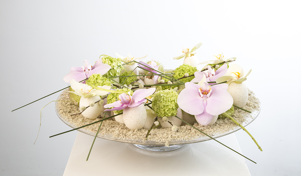 Easter is not all yellows and greens: orchids in a subtle shade of pink, give this creation by Pim van den Akker a little sweetness to it.
