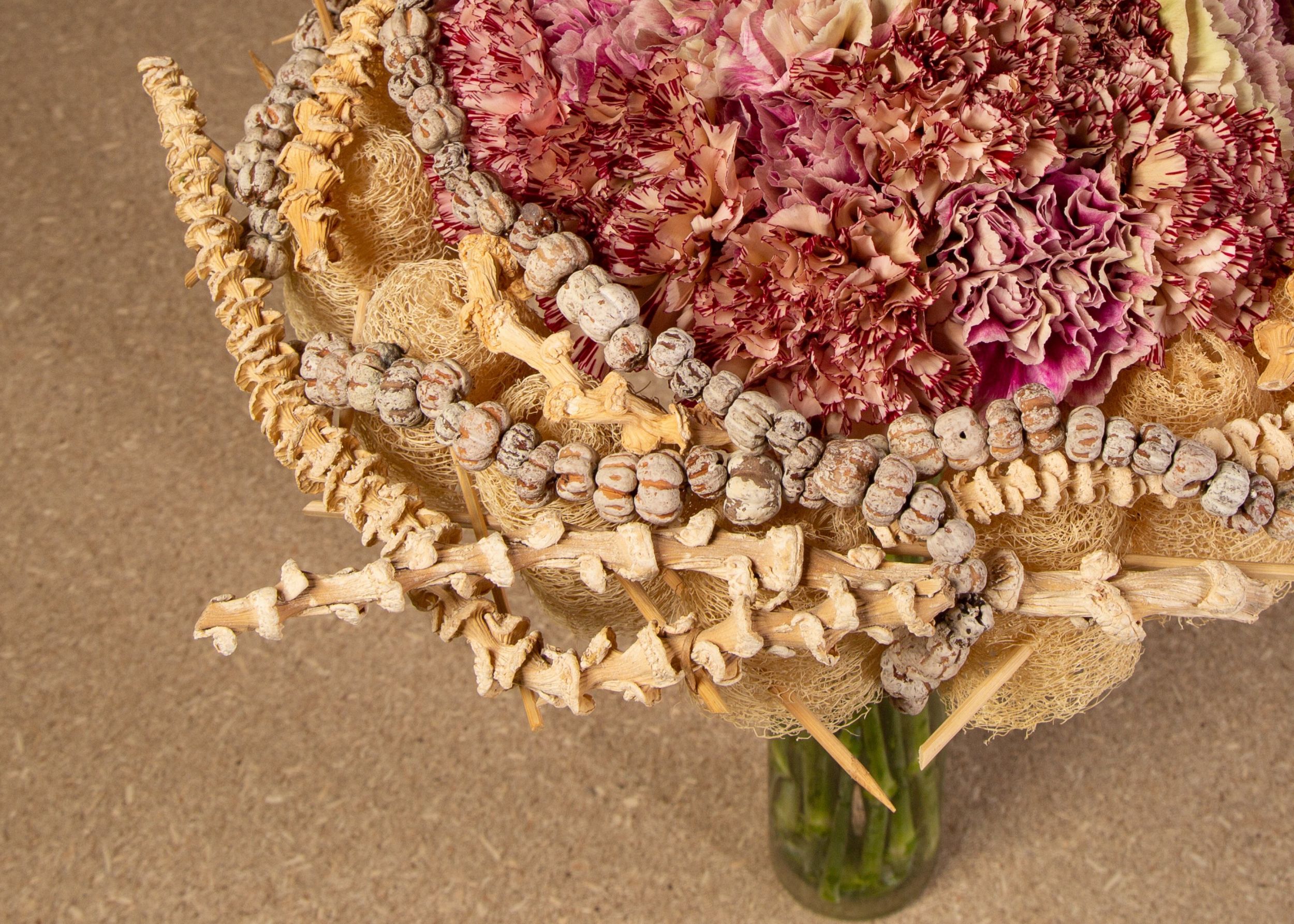 In this contemporary carnation bouquet, Pim van den Akker used various Dianthus varieties in pink and salmon shades. The colours of the Trendy Dianthus look wonderful with cream-coloured materials. The frame is made of luffa's which are connected with sticks. The stems of the carnations are kept long for an elegant look. As a finishing touch, details are added like a string with dried fruits.