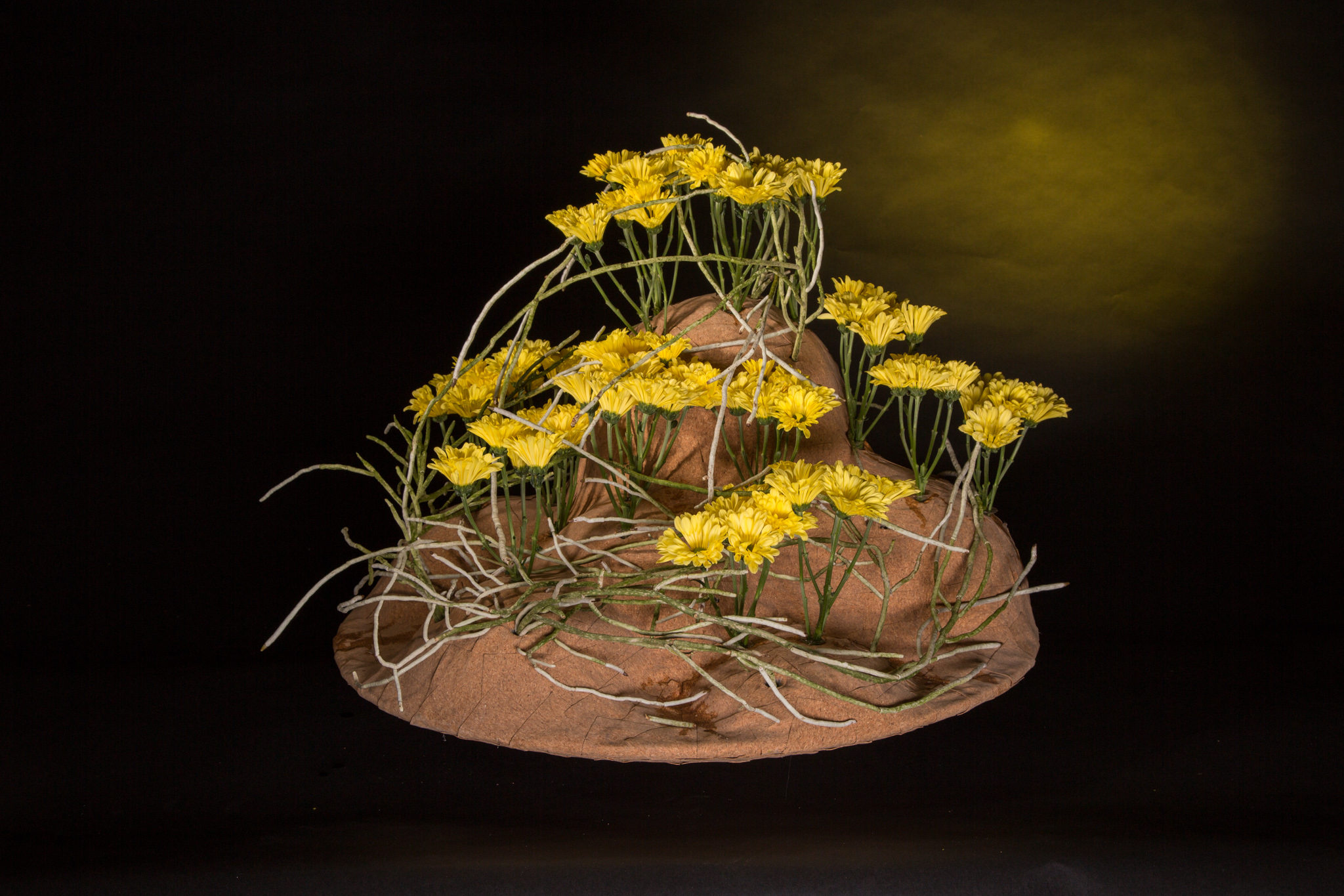 Chrysanthemum 'Nibali' is a powerful new variety with a cool feature: the flower petals will close when the flower is harvested and will slowly open up once they are placed in water, revealing the bright green center. Pim van den Akker placed the 'Nibali' in an organically shaped object treasuring the beautiful flowers.