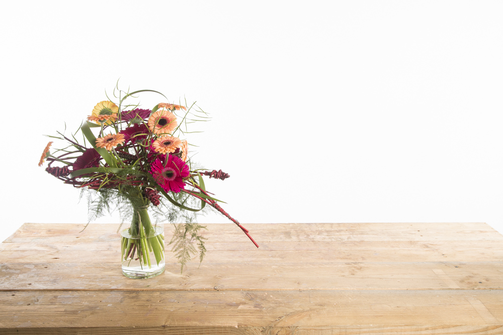 Pim creates a sweet frame with red cornus stems as a base for Gerbera Dasies 'Dusty' and 'Clasico' and some airy greens.