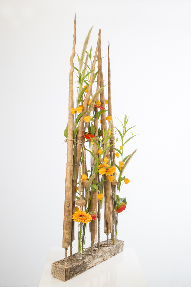 David creates a jungle-like piece with wood, 'liana' from binding wire and luscious 'vegetation' with Adios® Red Anthuriums, Sandersonia, Bonita Gerbera's and grasses.