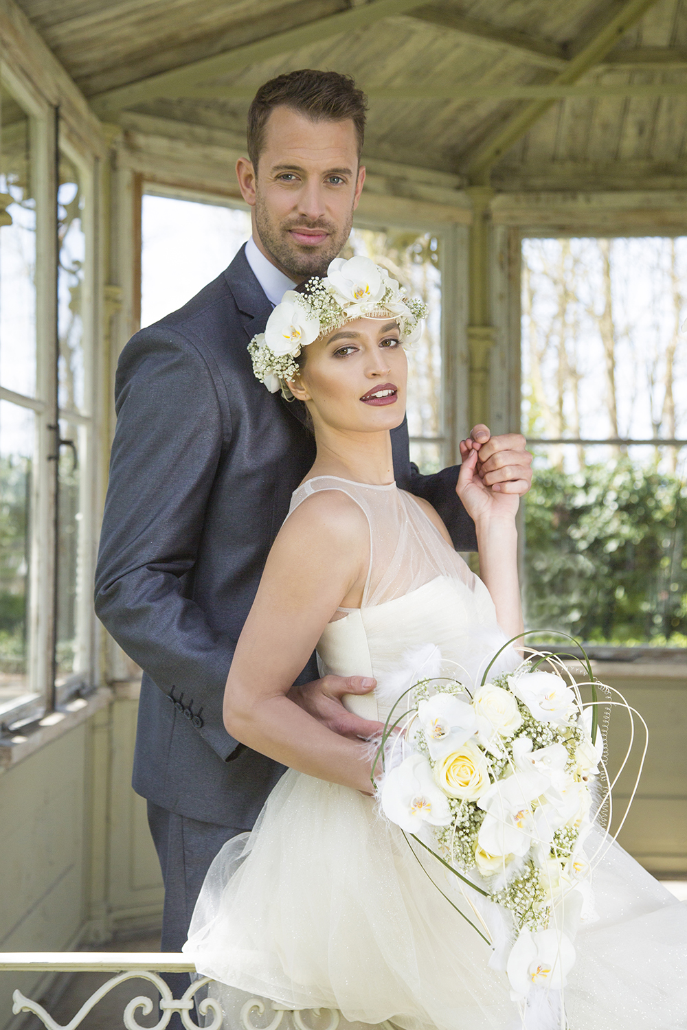 Totale bruidsversiering, hartvormig bruidsboeket en haarversiering met 'Kobe' orchideeën van Ichtus Flowers. Pim van den Akker laat zien dat bruidswerk ook in andere vormen gemaakt kan worden.