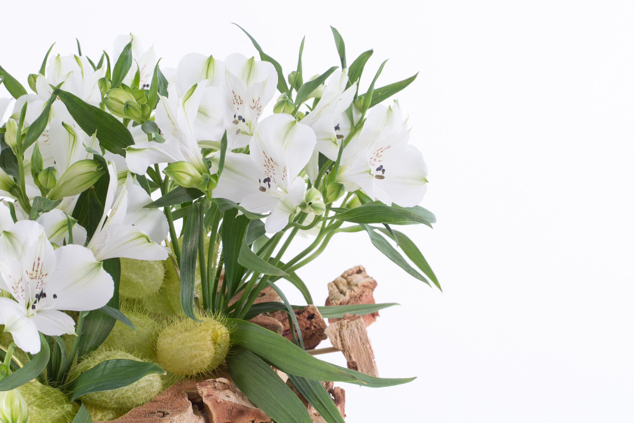 Pim van den Akker has made a bouquet with the white Alstroemeria 'Frozen' in which the natural green colours are accentuated by using other natural materials: cork and Asclepias. Two half circles are attached to each other with Tonkin sticks which are finished off with a piece of cork on the tips. Tonkin sticks have also been stuck into the bottom so a clear natural frame is created in which the Alstroemeria can easily be arranged. As an extra detail, green Asclepias 'Moby Dick' is placed alongside the Alstroemeria 'Frozen' which makes the fresh and natural bouquet complete.