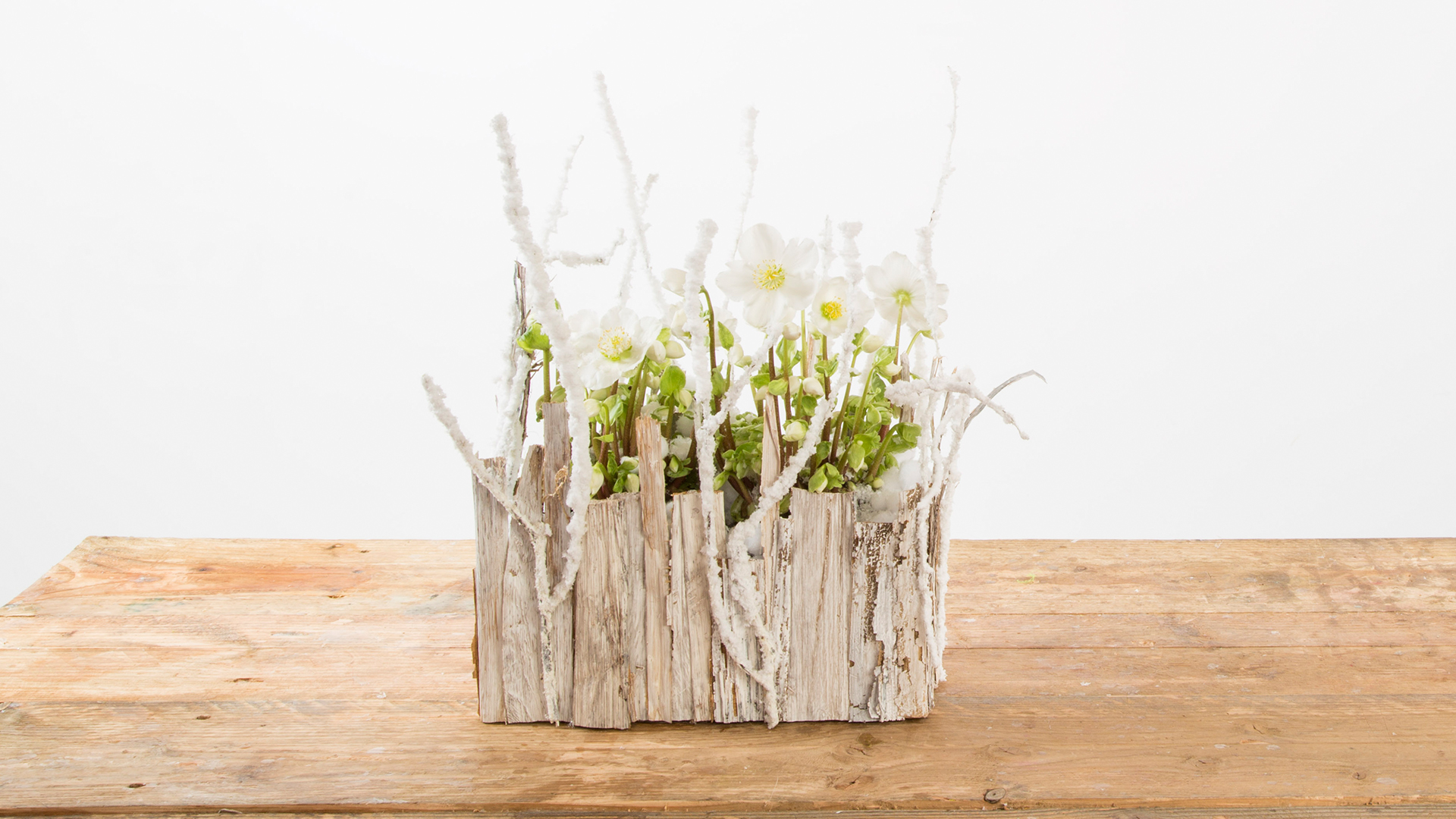 Nelleke maakt een winter wonderland met Helleborus planten in een ondergrond van hout.
