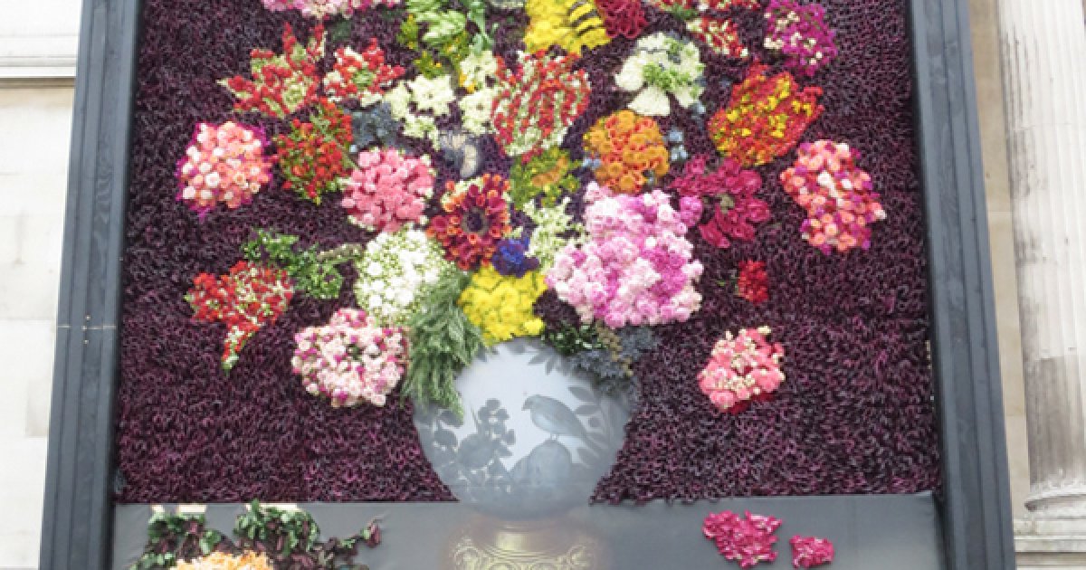 Standing 6.2 metres tall by 4.6 metres wide, the floral masterpiece was a combined effort of almost 30 florists over 2 days. It features over 25,000 stems of 26 different types of real cut flowers including tulips, peonies, carnations, freesias, calla lilies, roses, alliums, cornflowers, nigella, chrysanthemums, spray roses, echinacea and lilies.