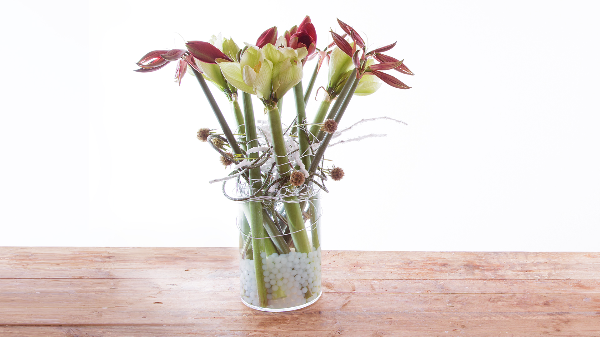 Amaryllis 'Challenger', 'Ferrari' en 'Tango' in de hoofdrol in deze winterse vaasschikking.