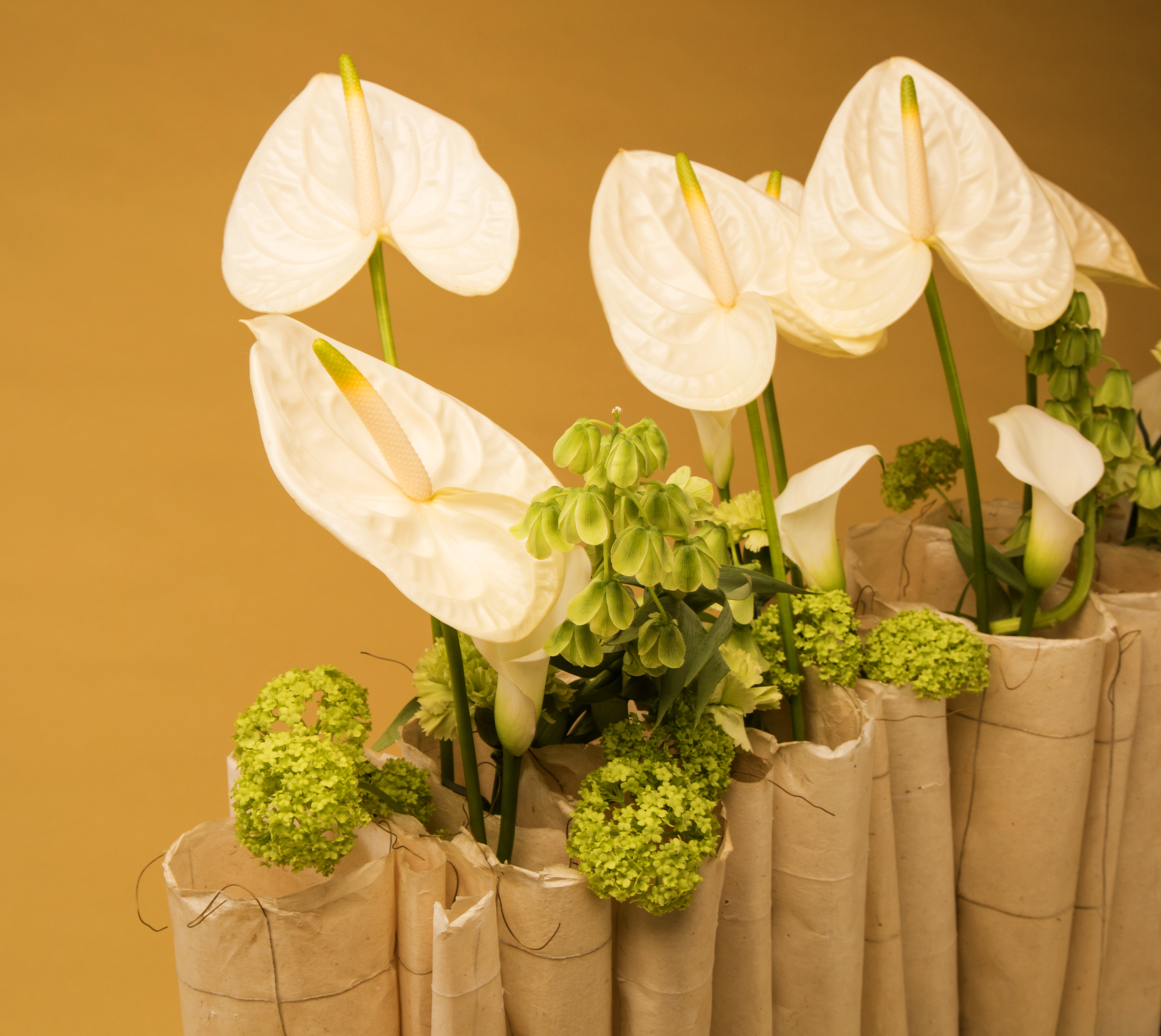 Geertje Stienstra heeft een Zigzag design gemaakt van papier, Anthuriums, Calla's en Viburnum. Het papier is voorzien van draad waardoor het makkelijk buigbaar is.