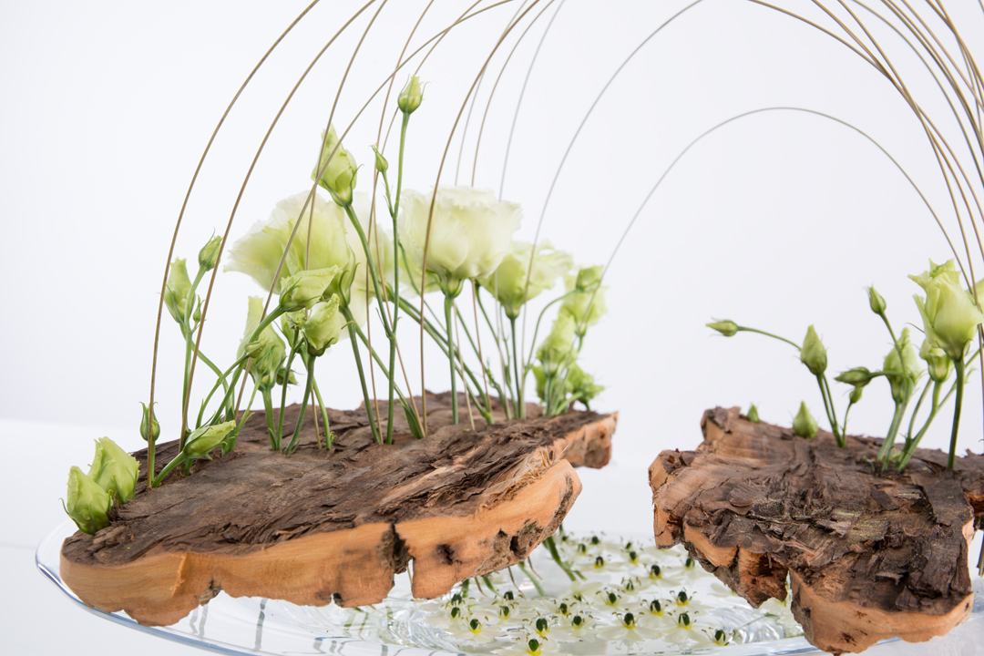 Spannend bloemwerk met Lisianthus. De boog over het water, de prachtige witte bloemen, het hout en de drijvende losse Ornithogalum bloemetjes in het water geven dit design van Roos van Unen een feeërieke uitstraling.