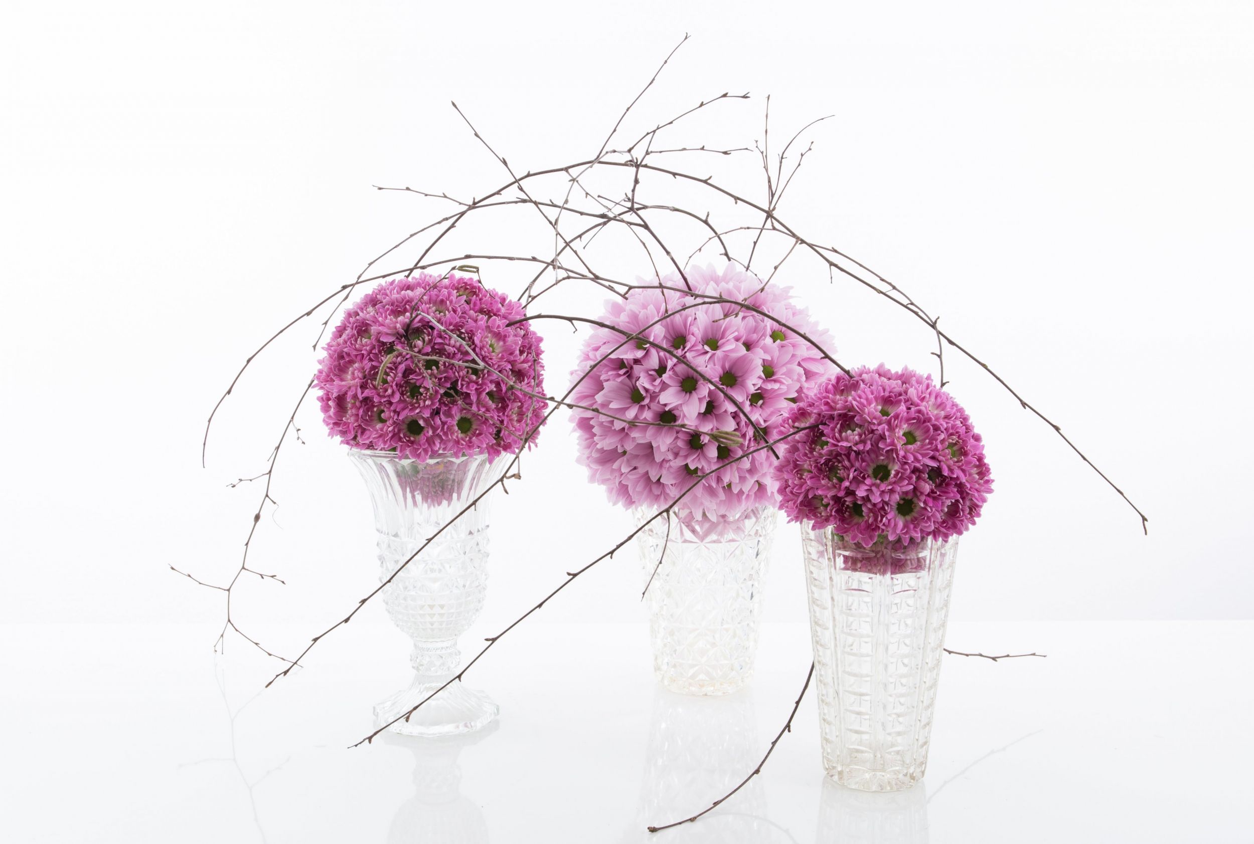 De Chrysant is een bloem bij uitstek voor gebruik in een basis van steekschuim. Deze bollen, gemaakt door Pim van den Akker, zijn prachtig in hun eenvoud. De focus in deze designs ligt geheel op de prachtige bloemen van de variëteiten Softone' en 'Prada Sweet' van Zentoo Chrysanten. De toevoeging van een subtiel takje en de glazen vazen waarop de bollen zijn geplaatst geven de bloemen extra allure.