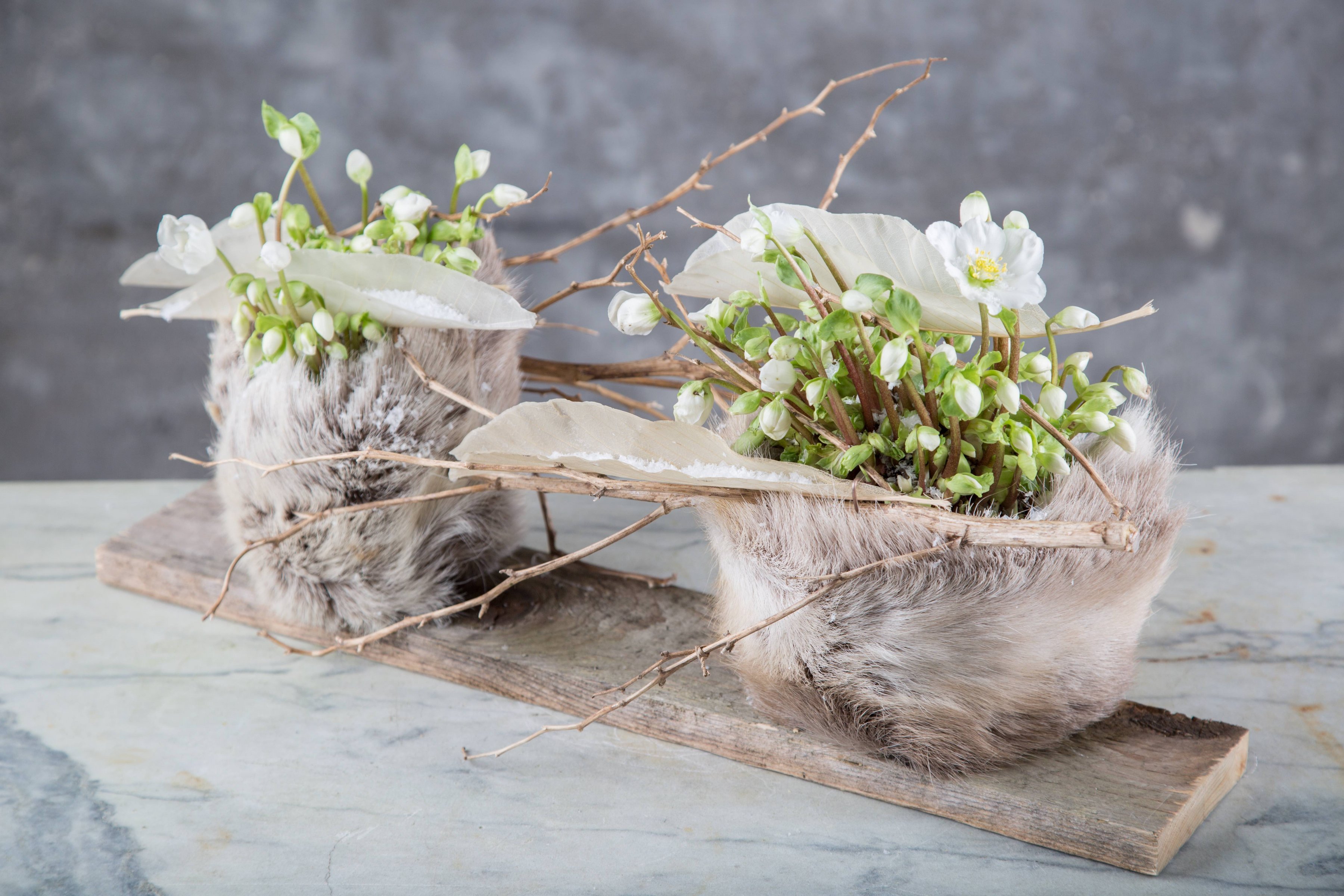 Pieces of fake fur are used to cover plain containers using hot glue. The soft brown fabric and the crisp white flowers of the Hellebores make up for a beautiful combination.