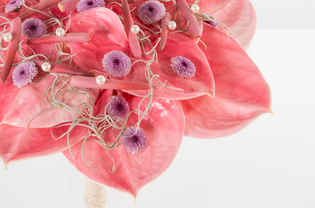 Een voorbeeld van een bruidsboeket met Anthurium. Voor een speels effect sneed Pim van den Akker de kolf (spadix) los en prikte deze elders in het boeket vast met sierparels. Extra detail: gelijmde losse Chrysantjes en wat Tillandsia.
