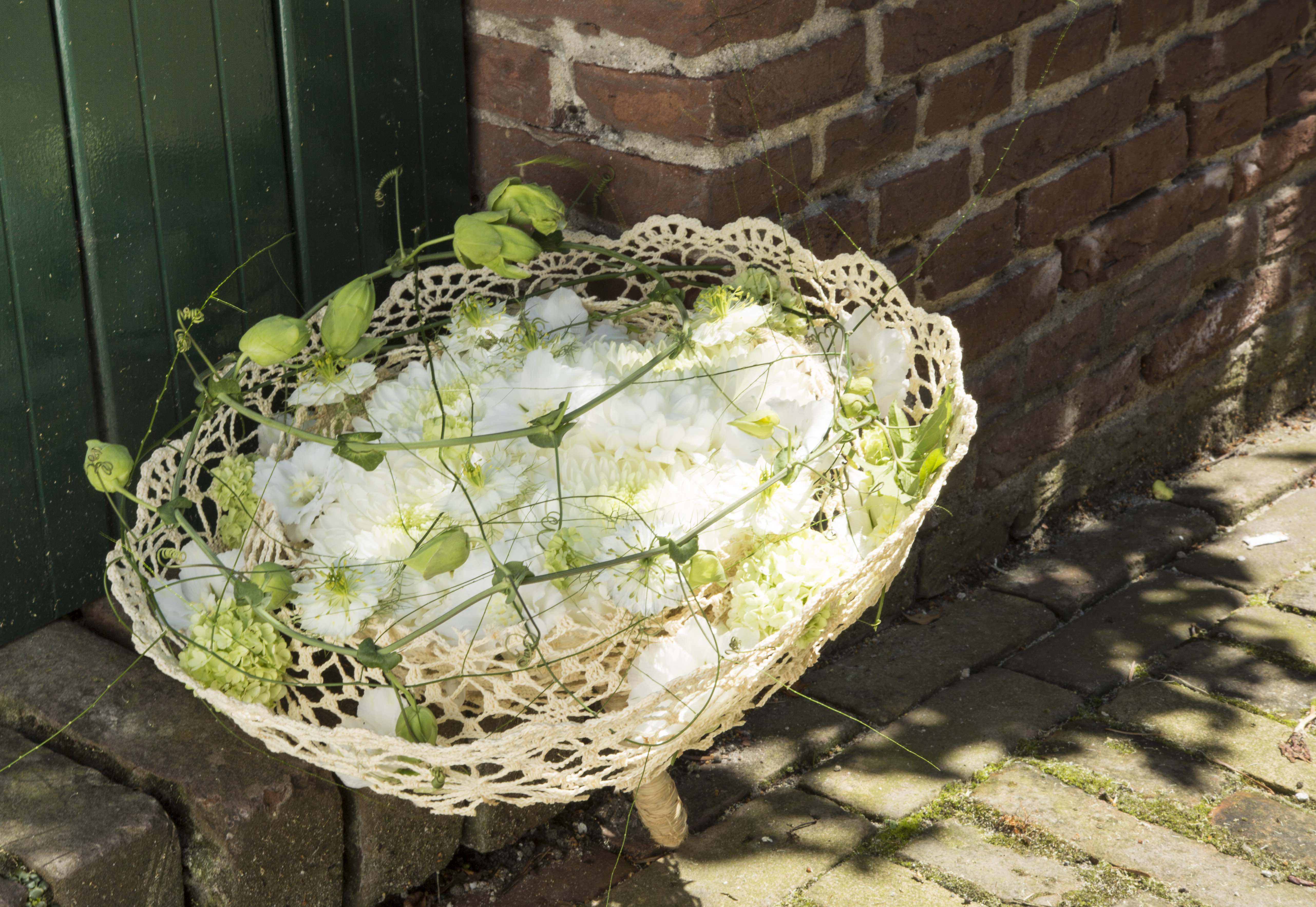 Bruidsboeket met spierwitte 'Magnum' Chrysanten. Pim van den Akker voegde daar wat passie(flora) aan toe en losse Delphinium bloemen, Juffertje in het groen en Viburnum. De houder is een oude lampenkap met kanten uitstraling.