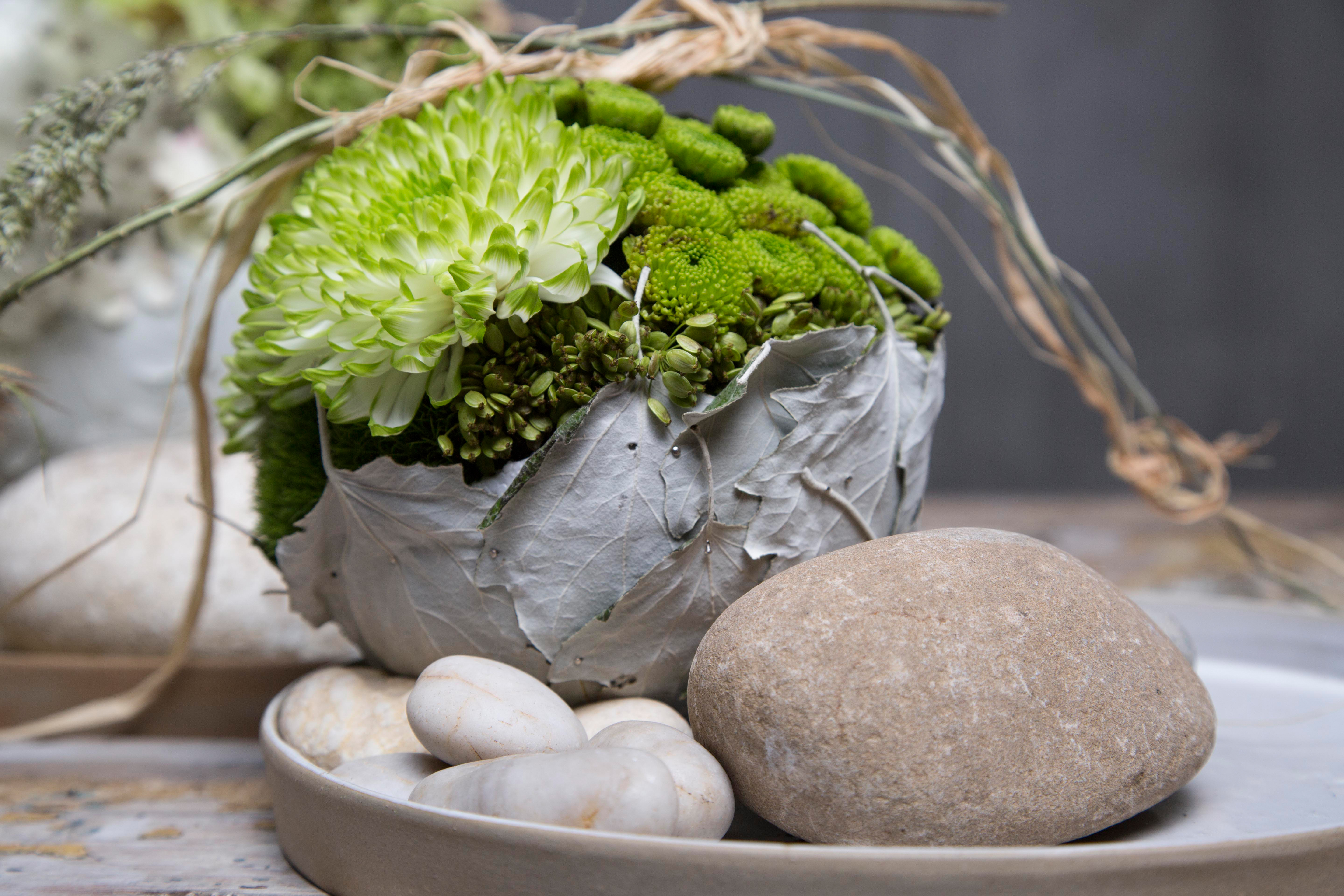 Bloemsierkunstenaar Klaus Wagener maakte een 'stenen' landschap van verschillende soorten Chrysanthemums, in dit geval 'Zembla Lime', in combinatie met natuurlijke materialen.