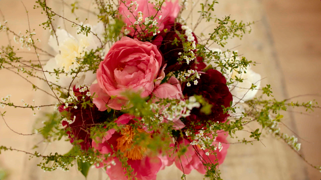 'Duches', 'Red Charme', 'Flame' en 'Pink Hawaii' zijn slechts een paar van de prachtige soorten pioenrozen. Nelleke Bontje gebruikte deze in een eenvoudig boeket gecombineerd met Spirea bloesem en fineer als finishing touch. Elegante eenvoud!