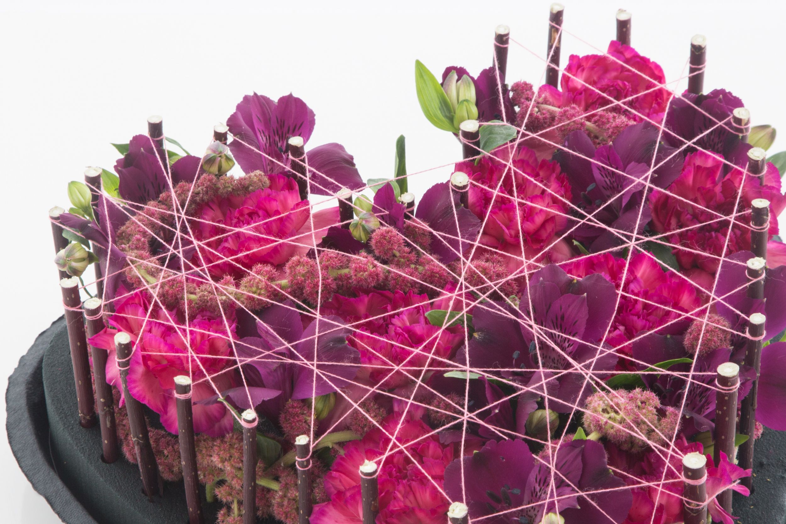 Met deze hartvormige OASIS® Black Ideal maakt Roos van Unen een mooi hart voor Valentijn. De diversiteit van de prachtige Anjers en Alstroemeria in dieprood, roze en paars tinten, gecombineerd met het zwarte steekschuim, zorgt voor extra diepte. Het gespannen draad zorgt voor een strakke beweging in het design. De amaranthus onder het draad gedrapeerd creëert een zwoele beweging. De combinatie van strakke lijnen, sensuele golfbewegingen en de diepe kleuren zorgen voor een passioneel Valentijnsbloemstuk.