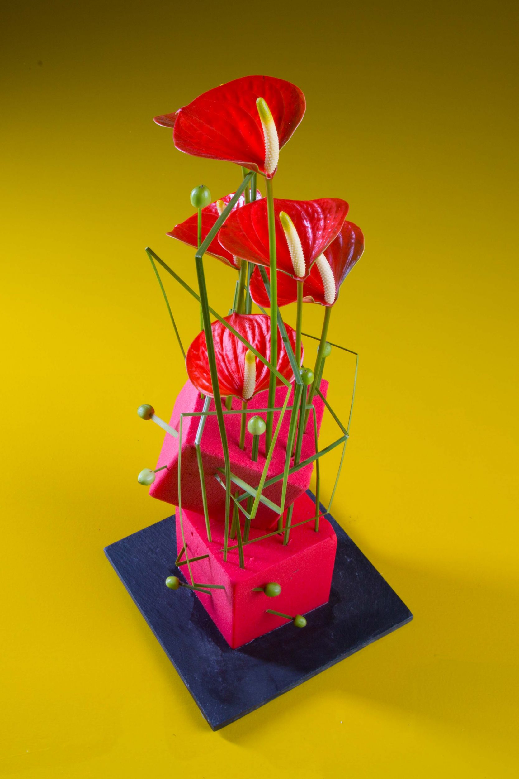 Roos van Unen gebruikt scherpe hoeken, kubussen en andere geometrische vormen om een strak ontwerp te creëren met prachtige Anthurium en staalgras. Een out-of-the-box idee met een modern en kleurrijk tintje. Het Oasis Rainbow steekschuim komt hier goed tot zijn recht met zijn felle kleur die mooi matched met de gebruikte materialen.