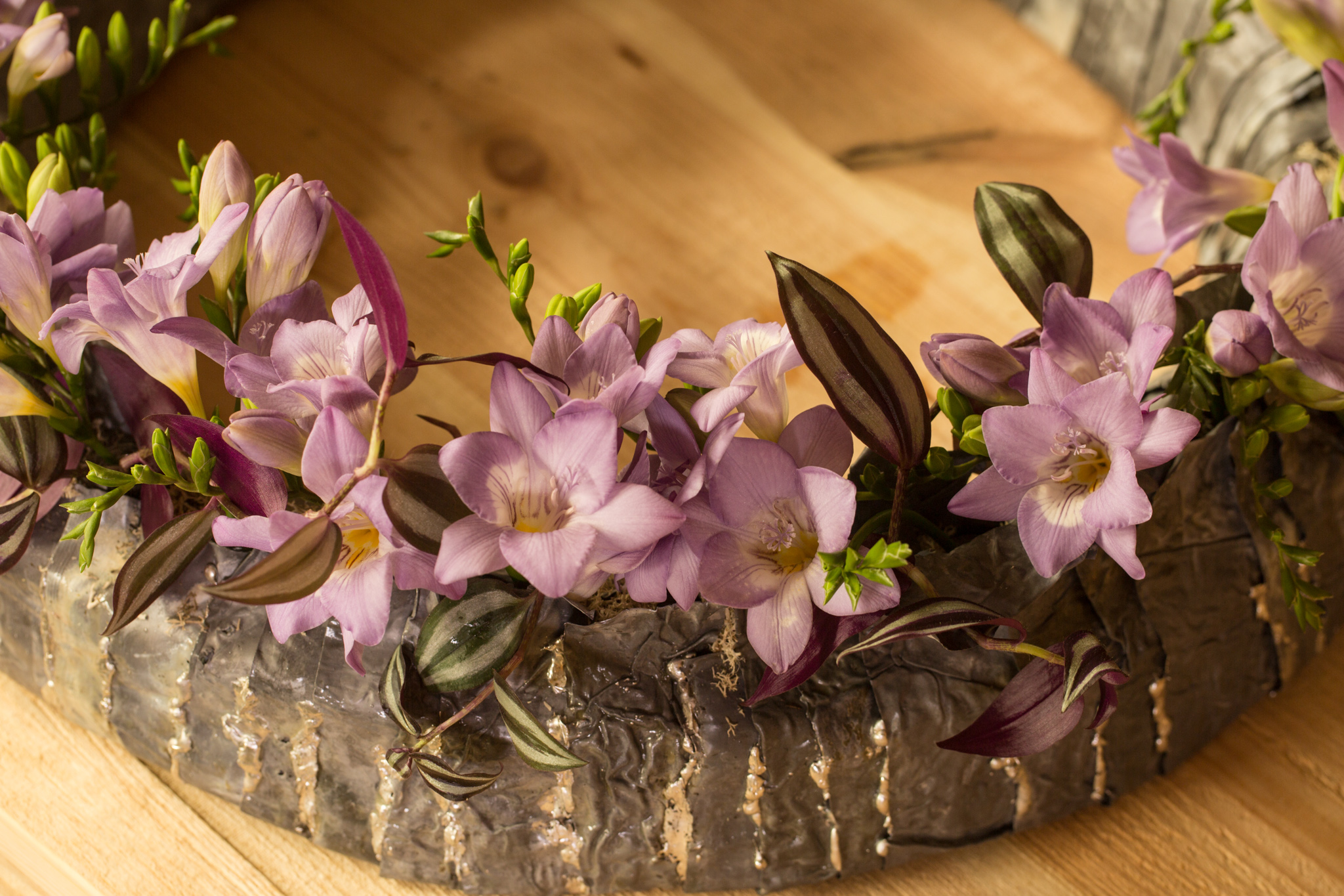 Voorbeeld van afscheidsbloemwerk met Freesia. De Freesia heeft voor veel mensen een emotionele betekenis. Geen wonder dat de bloem veel gebruikt wordt in afscheidsbloemwerk. Roos van Unen maakte deze mooie krans met paarse Freesia en de bladeren van de Tradescantia. De steekschuim ring van OASIS is bedekt met repen snijlood.