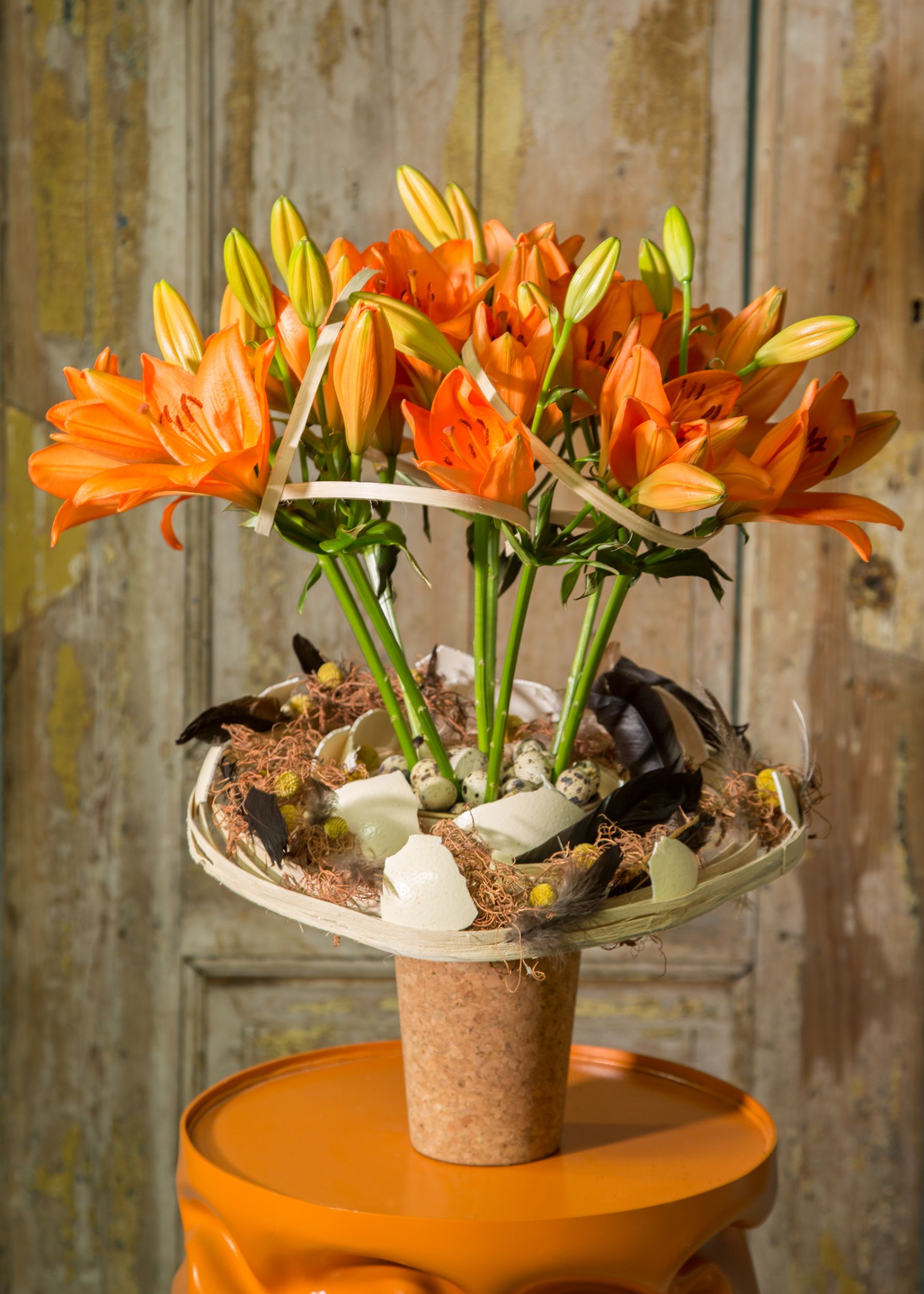 Oranje in je paasbloemstuk kan heel goed werken. Wanneer de oranje Sunderland lelie van Royal van Zanten Flowerbulbs helemaal open komt, steelt hij de show! Als je deze sterke lelies met hun opvallende kleur verwerkt maak je zeker de blits. Daarnaast zijn de Sunderland lelies geurloos. Leuk om zo'n uitgesproken kleur te gebruiken in paasbloemwerken. Voeg nog wat paasdetails toe zoals eierschalen om het compleet te maken.