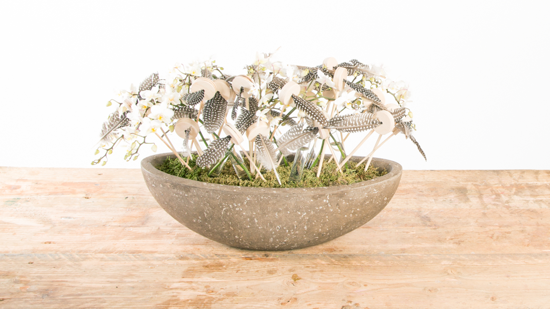 Bekijk hier hoe je met behulp van veren een prachtige paascreatie kunt neerzetten. Alex maakt een speels arrangement met orchideeën en veren.