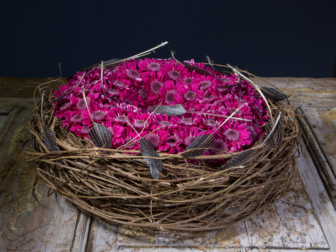 Een paarse rouwkrans van Pim van den Akker met de Chrysant 'Stresa Purple' en wat mooie veertjes.