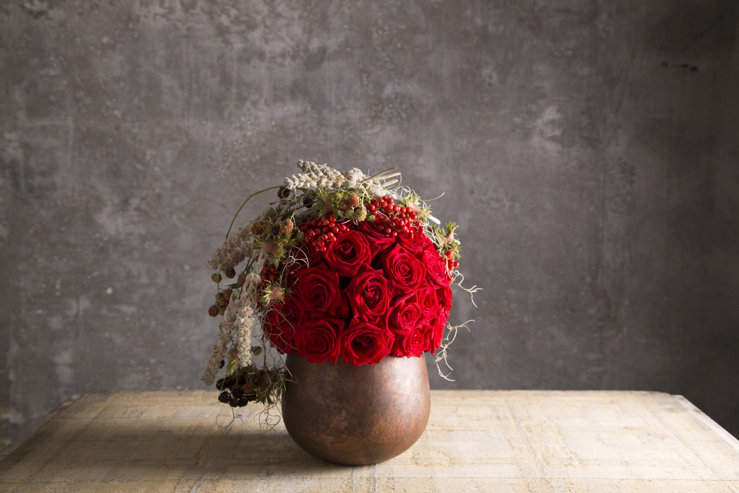 The 'Red Eagle' is a bright red beauty and stunning to use in any arrangement. Pim van den Akker combined these roses with some season berries and foliage.