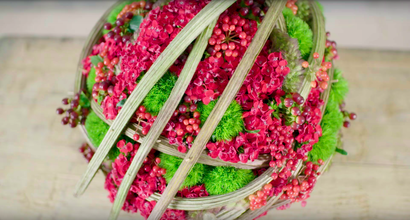 Pim van den Akker deelt een idee voor een bloemwerk in herfstsfeer en gebruikt hierin de Sparkz 'Baron Breanthus' en 'Green Trick' van HilverdaKooij. Op een basis van Oasis creëert hij een frame met stengels van groot hoefblad ofwel Petasites. Makkelijk te maken, rijk resultaat!