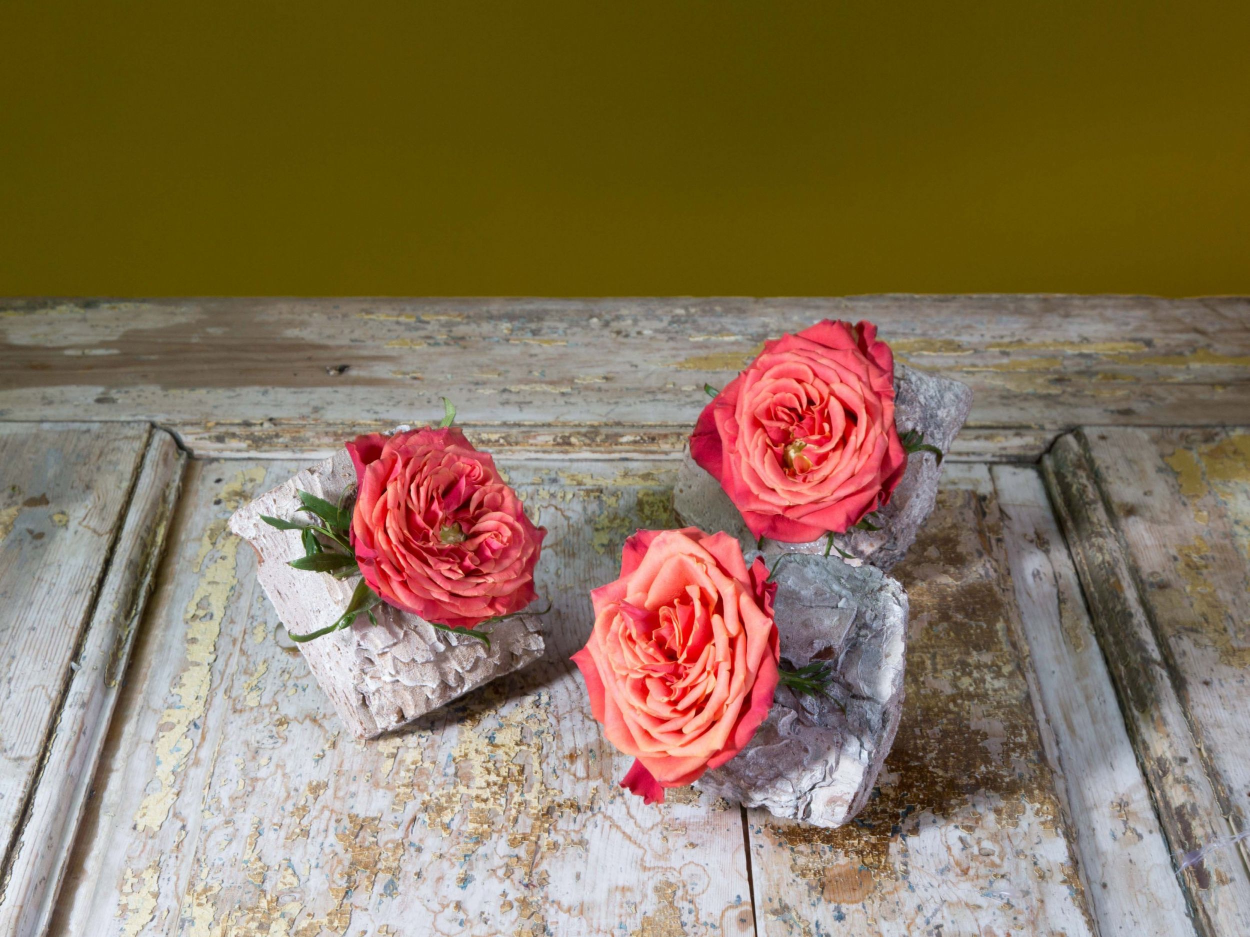 Een stukje schors, een glazen buisje en een roos. Dat is alles wat je nodig hebt voor dit lieflijke bloemwerk. Boor een gat in het stuk schors, plaats er een glazen buisje in en voeg je bloem toe. Et voila! Een idee van Pim van den Akker.