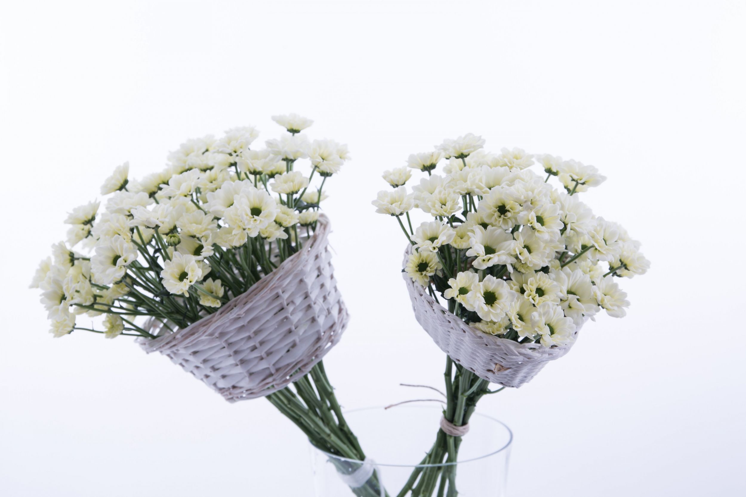 Pim van den Akker ziet mogelijkheden in ieder materiaal! Wie kent ze niet; de kleine geweven mandjes waar doorgaans plantenarrangementen in zitten. Laten die nou ook heel goed dienst doen als frame voor een boeket. Met deze ivoorkleurige snoepjes met groen hartje; de 'Proscini' chrysant van Zentoo vormt het een schattig geheel!