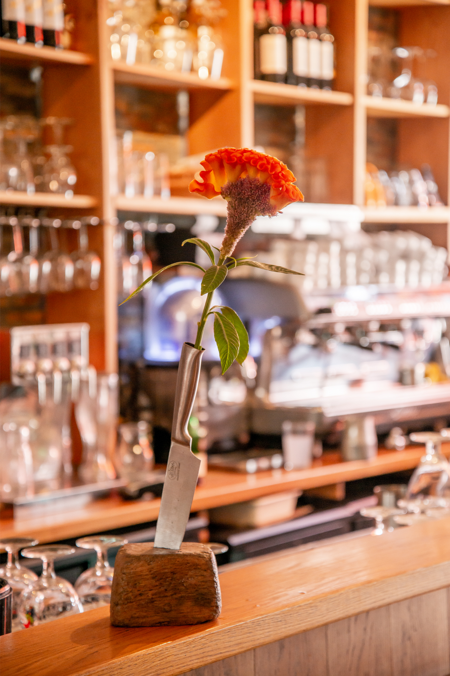 Hoe maak je origineel bloemwerk om de horeca te verleiden meer met bloemen en planten te doen? Door aan te sluiten op hun belevingswereld! Met een gaaf en origineel object als dit mes wat tot vaasje is omgetoverd door Pim van den Akker. Zo'n vaas op tafel is voor bezoekers gelijk een mooi gespreksonderwerp!