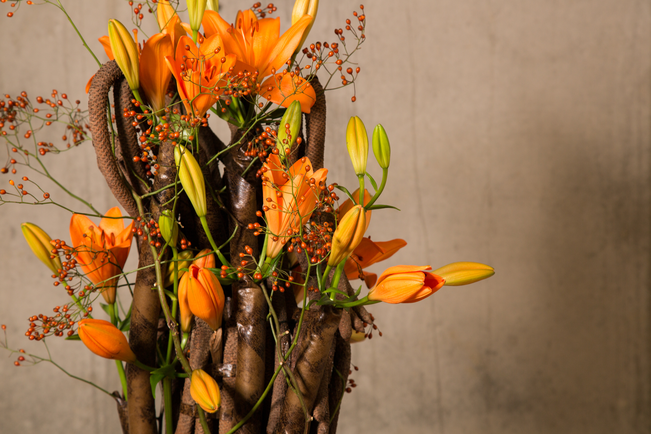 Voorbeeld van een spannend bloemwerk met oranje Sunderland lelies van Kristel van Dijk. Oranje is natuurlijk dé kleur voor de herfst en gecombineerd met rozenbottels is dit stuk een eycatcher van jewelste. En een stuk waar je lang van kunt genieten want deze geurloze lelies zijn lang houdbaar. Een uitgesproken krachtig arrangement!