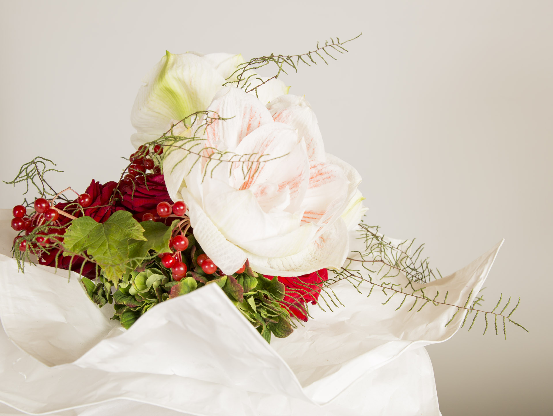 Bea maakt een vlinders in je buik-boeket met grote 'Red Naomi' rozen, amaryllis en Viburnum.
