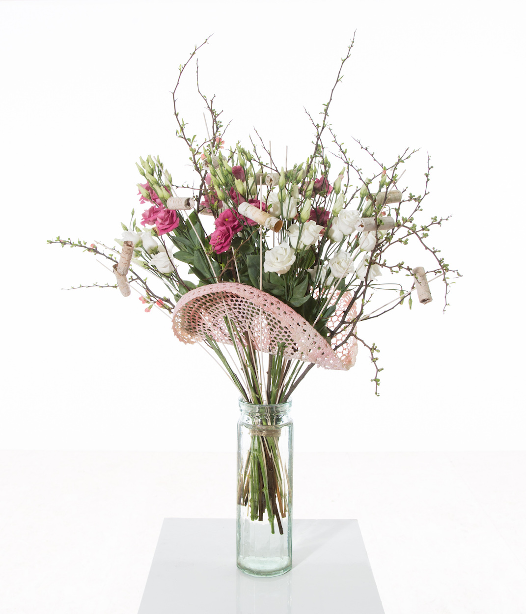Pim made this fan shaped flower bouquet with lisianthus. He folded an already made frame into a fan. Connected some sticks and the new base of this bouquet was ready. Some other details are rolled paper on sticks, combined with some blossom branches and you have a great bouquet!