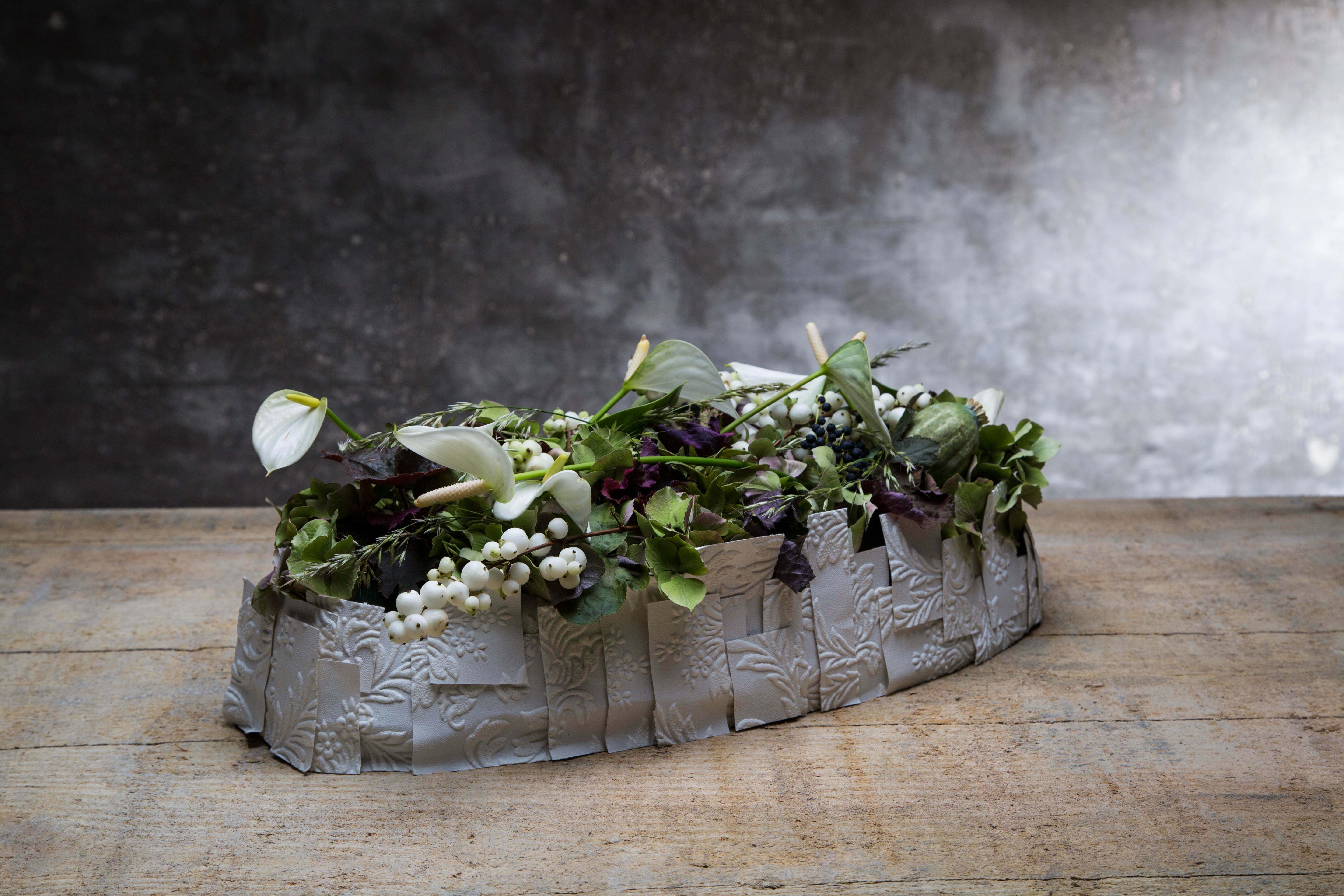 Rouwwerk van Spaanse bloemsierkunstenaar Bea Beroy met Adios® White anthuriums, hortensia, zaaddozen van de papaver en Symphoricarpos bessen. Een ingetogen en sereen afscheidsbloemwerk.