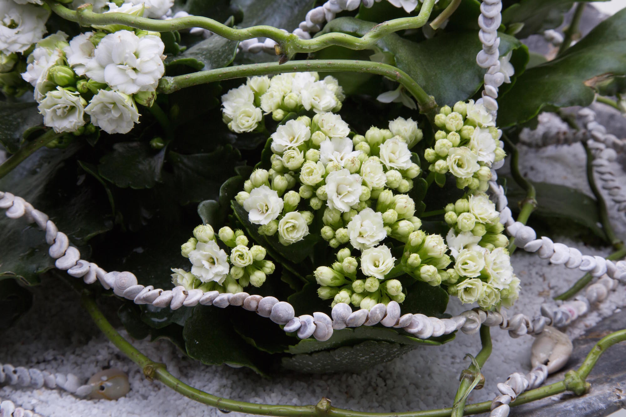 Detail of the white Kalanchoë plant arrangement. The Kalanchoë plant is decorated with a string of small shells and Stephanotis vines.