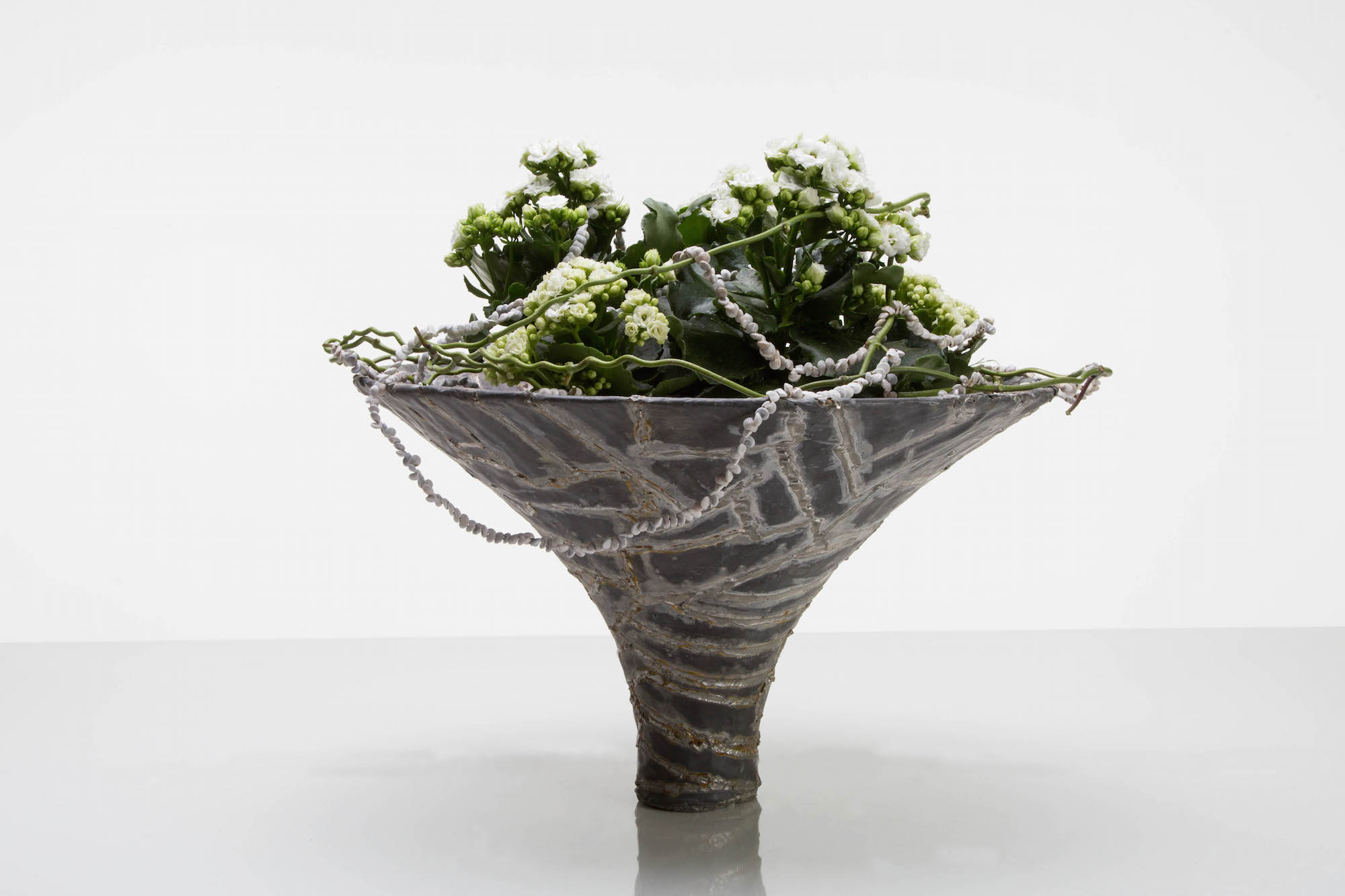 In een vaas dat volledig bedekt is met lood staat een mooie witte kalanchoe plant. Een klein detail in dit plantenarrangement is gemaakt met ranken van een andere plant (Stephanotis) en geregen strengen met schelpjes.