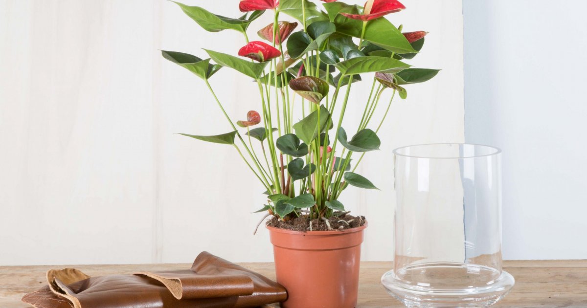 Roos van Unen heeft een Anthurium planten arrangement gemaakt met de Anthurium 'Adios® Red' van Fuerte Planta. Met een aantal materialen maak je gemakkelijk een eigenwijs plantenarrangement met leather look. Het bruin van het leer en de fel rode bloem van de Anthurium is een mooie krachtige, maar speelse combinatie.