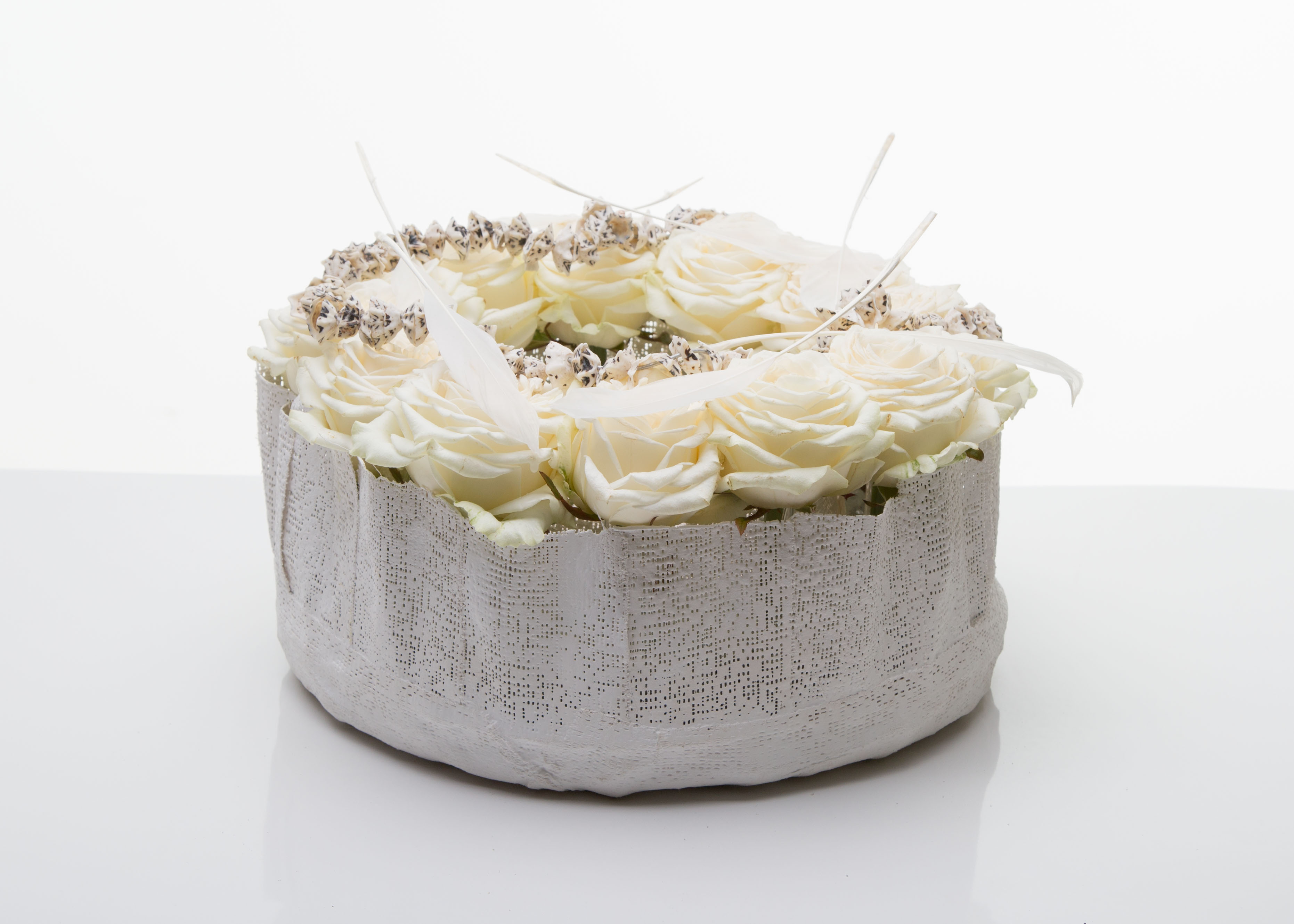 Winters taartje met prachtige witte rozen! Als detail is er een ketting van kleine witte schelpjes over het bloemwerk heen gedrapeerd!