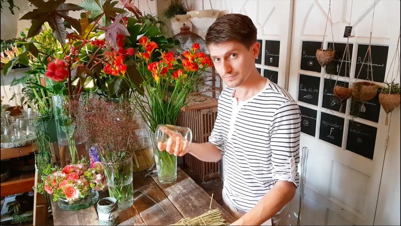 Een mooie #FreestyleFreesia van bloemist Dennis Lanzaat! Hij maakt een eenvoudige basis van tarwe wat het geheel een rustieke en hoogzomerse uitstraling geeft. De oranje en rode Freesia's vormen een mooi contrast tegen deze achtergrond en zijn gecombineerd met Physalis en rozenbottel. Love it!